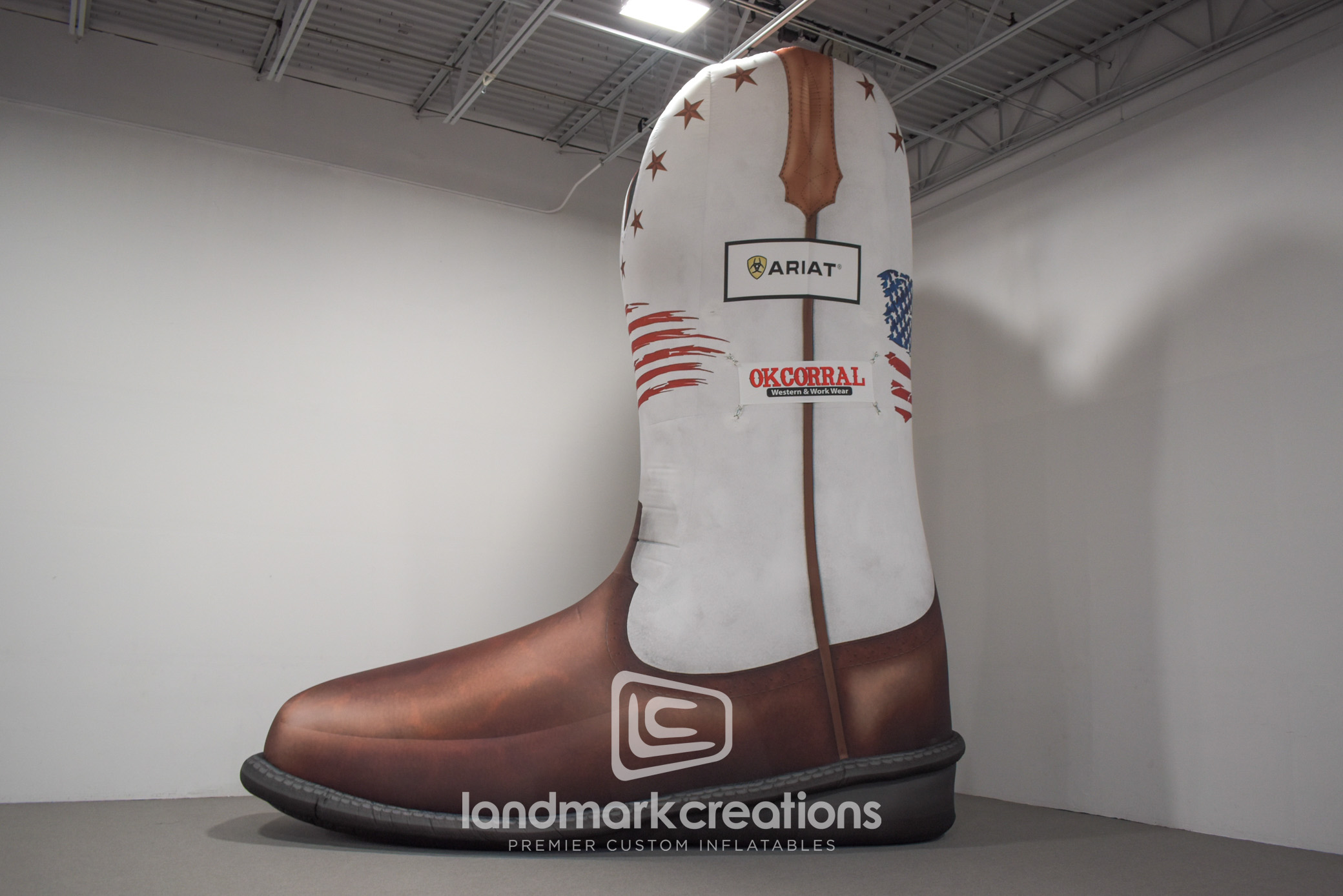 Landmark Creations partnered with OK Corral, a premier Western and workwear retailer in Vacaville, CA, to craft a custom inflatable replica of the iconic Ariat boot. This impressive outdoor display serves as a striking visual centerpiece, enhancing brand visibility and attracting customer attention. The boot features a meticulously printed logo, ensuring brand authenticity and durability for extended promotional use.