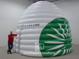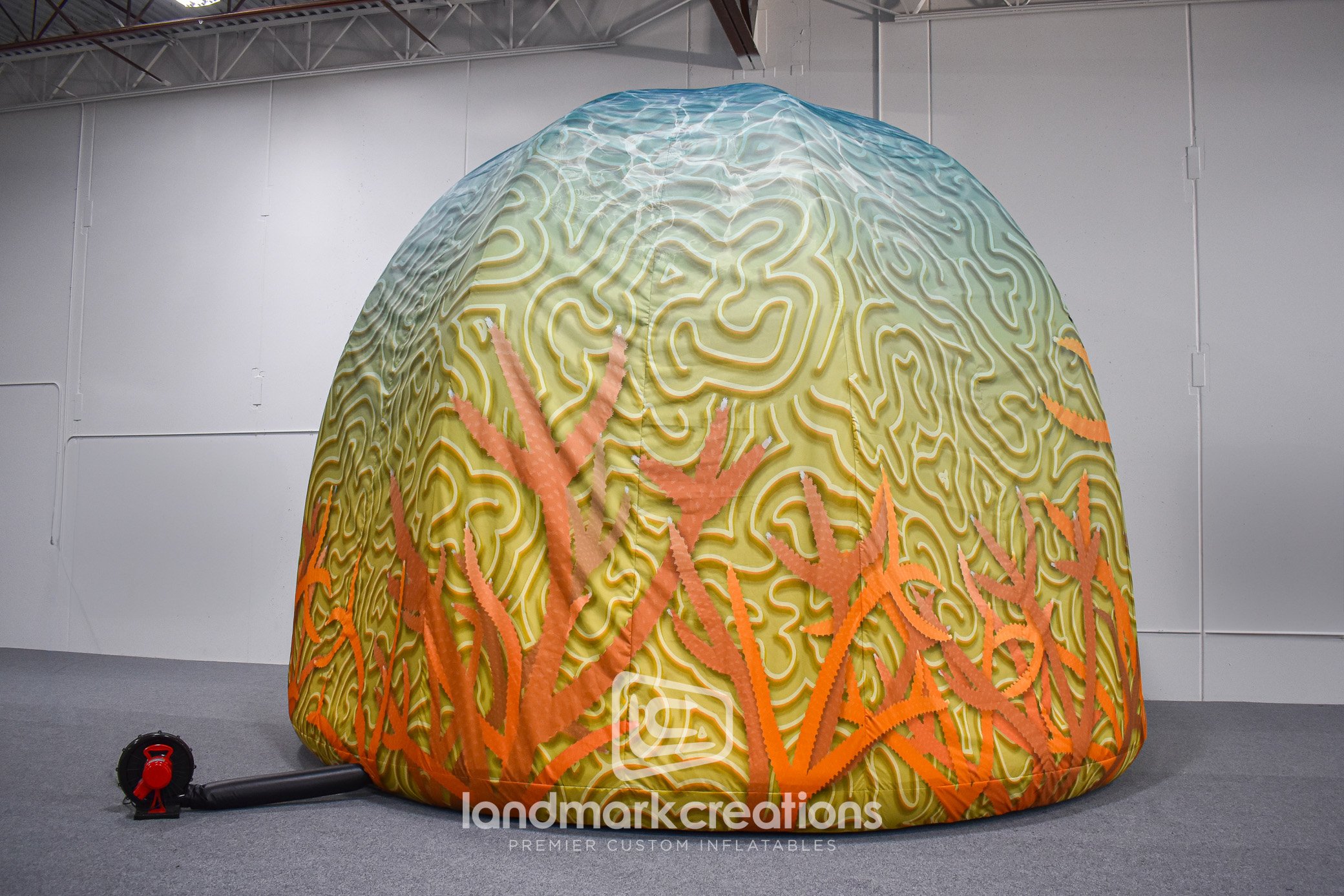 Landmark Creations partnered with Mote Marine Laboratory & Aquarium to create a stunning Brain Coral Tent inflatable. This 15 x 19 x 19-foot dome, inspired by Florida’s native coral reefs, features detailed flat art depicting staghorn coral and a dimensional logo to reflect Mote’s conservation-focused mission. With a 10-foot interior height, this inflatable is designed to fit standard exhibit halls, making it an engaging, portable solution for educational tours and museum events. Perfect for promoting marine biodiversity and sustainability, this inflatable dome brings the ocean’s beauty to life.