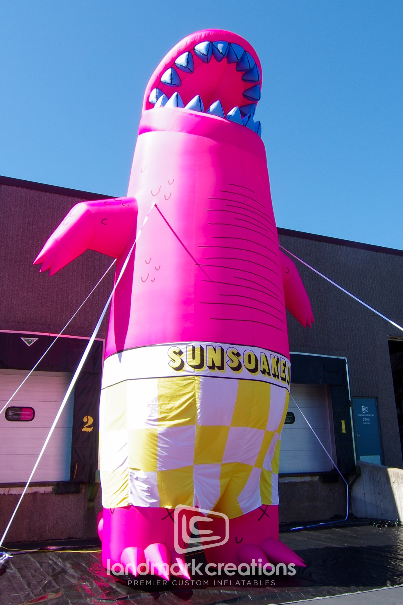 Several inflatable displays, including this fun dino mascot in boxer shorrts added to the beach day vibe at SunSoaked Music Festival 2019. Inflatable displays are a natural fit music festivals because they create instant visuals and transporting easily between events.