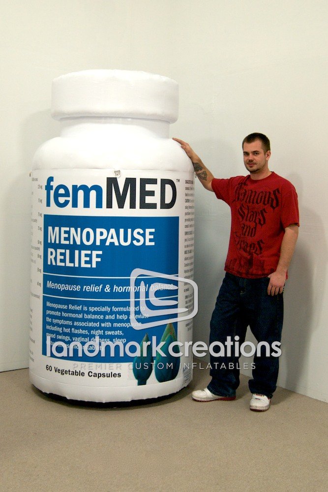 Custom inflatable product replicas are designed to look like their real life counterpart thanks to high-tech printing. femMED promotes their women's health supplements, including quality vitamins, minerals and herbs, by inflating this 7 foot product replica at health expos and trade shows.
