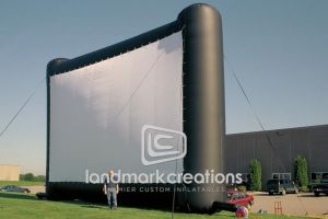 All you need is a projector and an electricity source. We do the rest! Made of top-quality nylon, these inflatable screens are durable enough for extended use outside. Custom-created, you can choose the size you need: 15 feet tall, 20 feet tall… 30 feet tall if you want it! Common designs look like either a traditional theater screen or a large-screen plasma screen, but we can easily create any specific design you have in mind.
