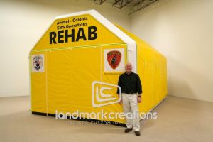 Because Landmark’s rehab and medical tents are cold-air inflatables (meaning they require a fan system to stay inflated), they are constructed from a lighter weight material than their sealed (airtight) counterparts, which makes them very easy to transport. The standard tent systems pack into 30” round carrying bags and weigh between 80# (small system) to 150# (large system).