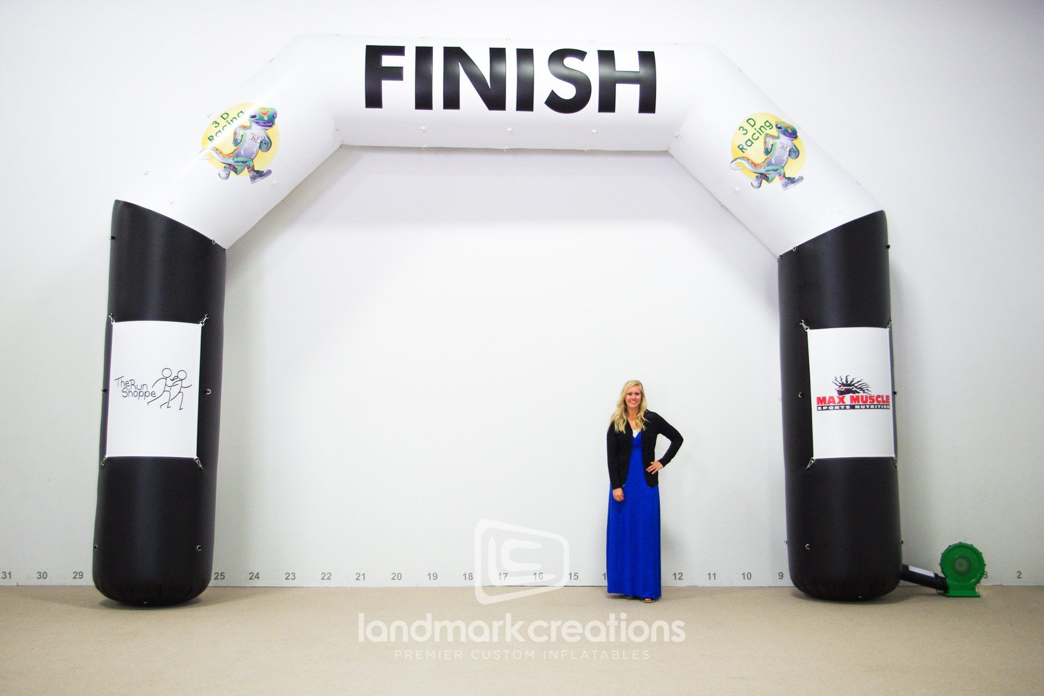 3D Racing, an event management and timing service company, inflates this custom-designed inflatable finish line at a variety of racing events. The inflatable archway is complete with d-rings for interchangeable sponsorship banners.