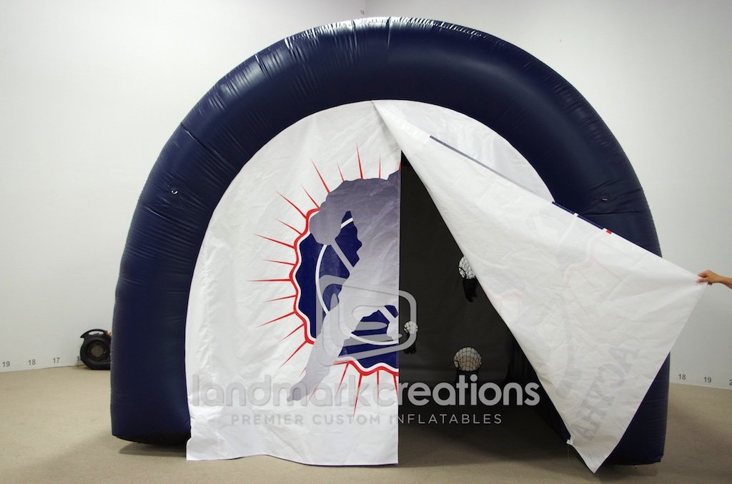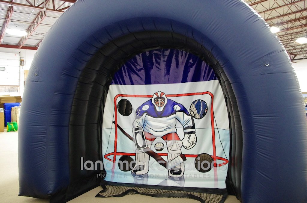 Armstrong Cooper Youth Hockey Association purchased this custom inflatable sports tunnel to use at football and hockey games. The traditional style sports tunnel has a removable backdrop banner that is used as a slap shot game at hockey events!
