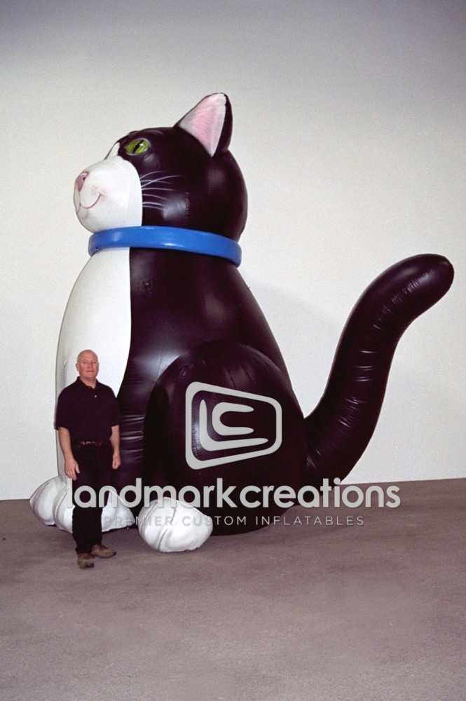 Large-scale, stationary mascots are typically created as cold-air inflatables used to advertise outdoors or in large spaces. This giant inflatable cat was used by Animal Planet to promote their TV shows.