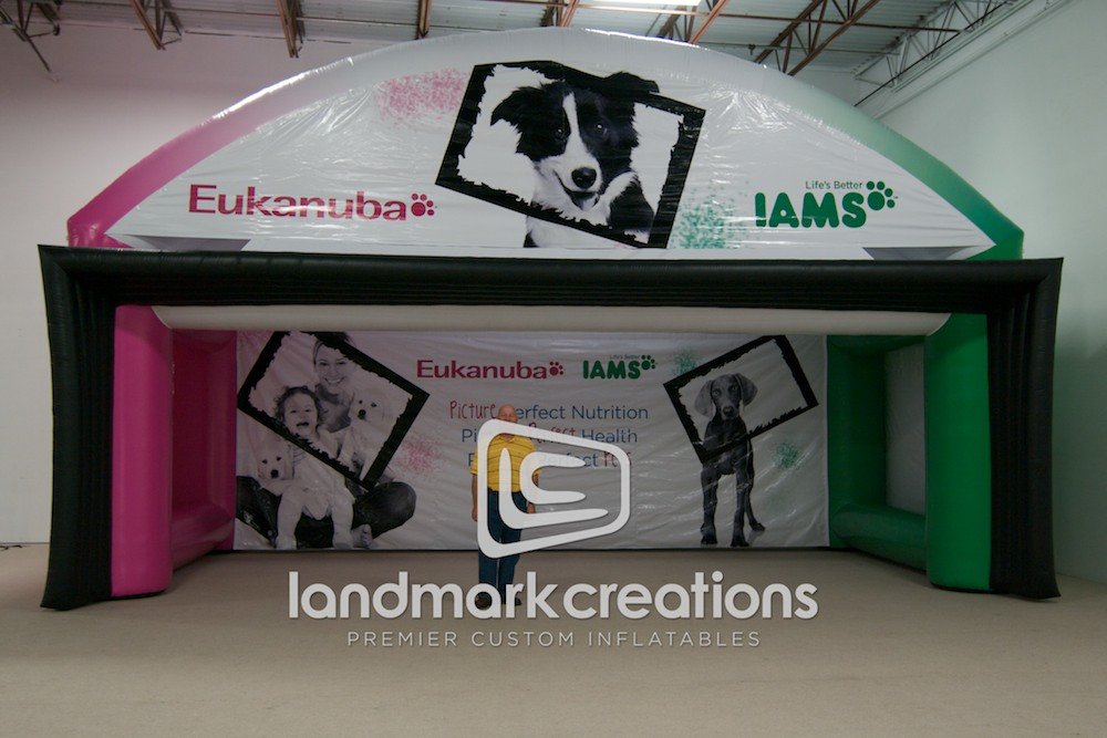 Increase visibility with an inflatable booth like the one made for Eukanuba and Iams. pet food brands. With a generous area for giving away product samples, this booth was a big hit by owners and their pets.