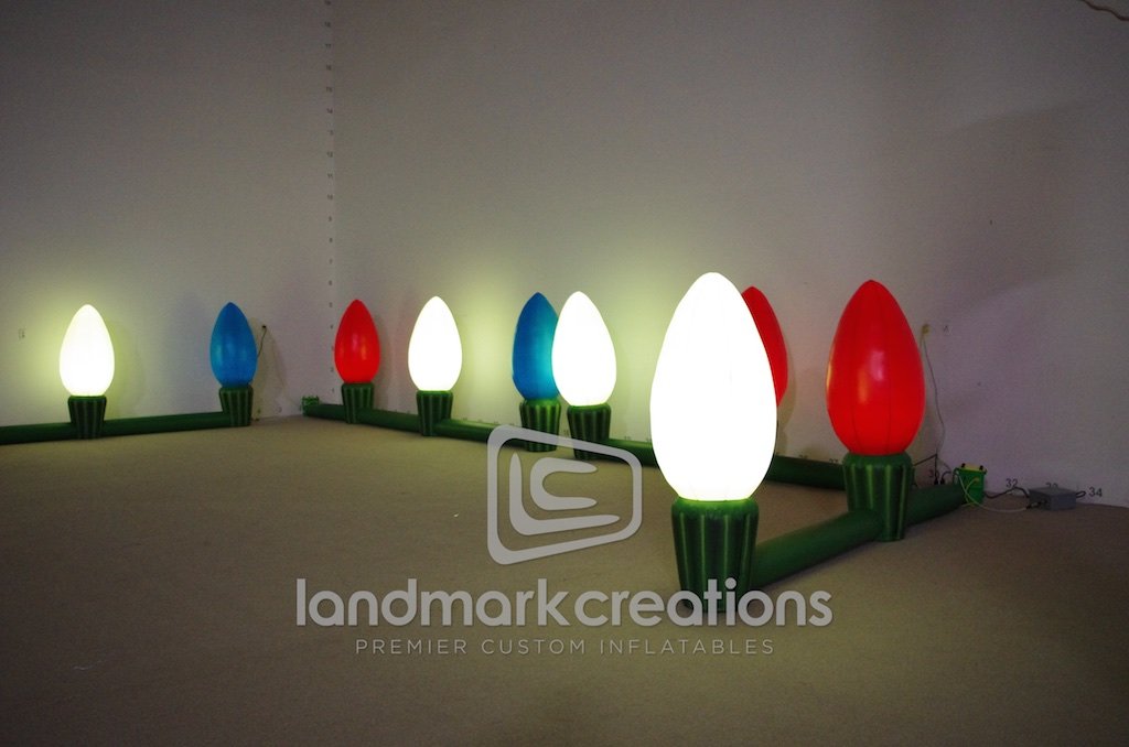These oversized inflatable Christmas lights were illuminated and display at Six Flags in Georgia! Giant holiday-themed inflatables create a fun atmosphere for visitors.