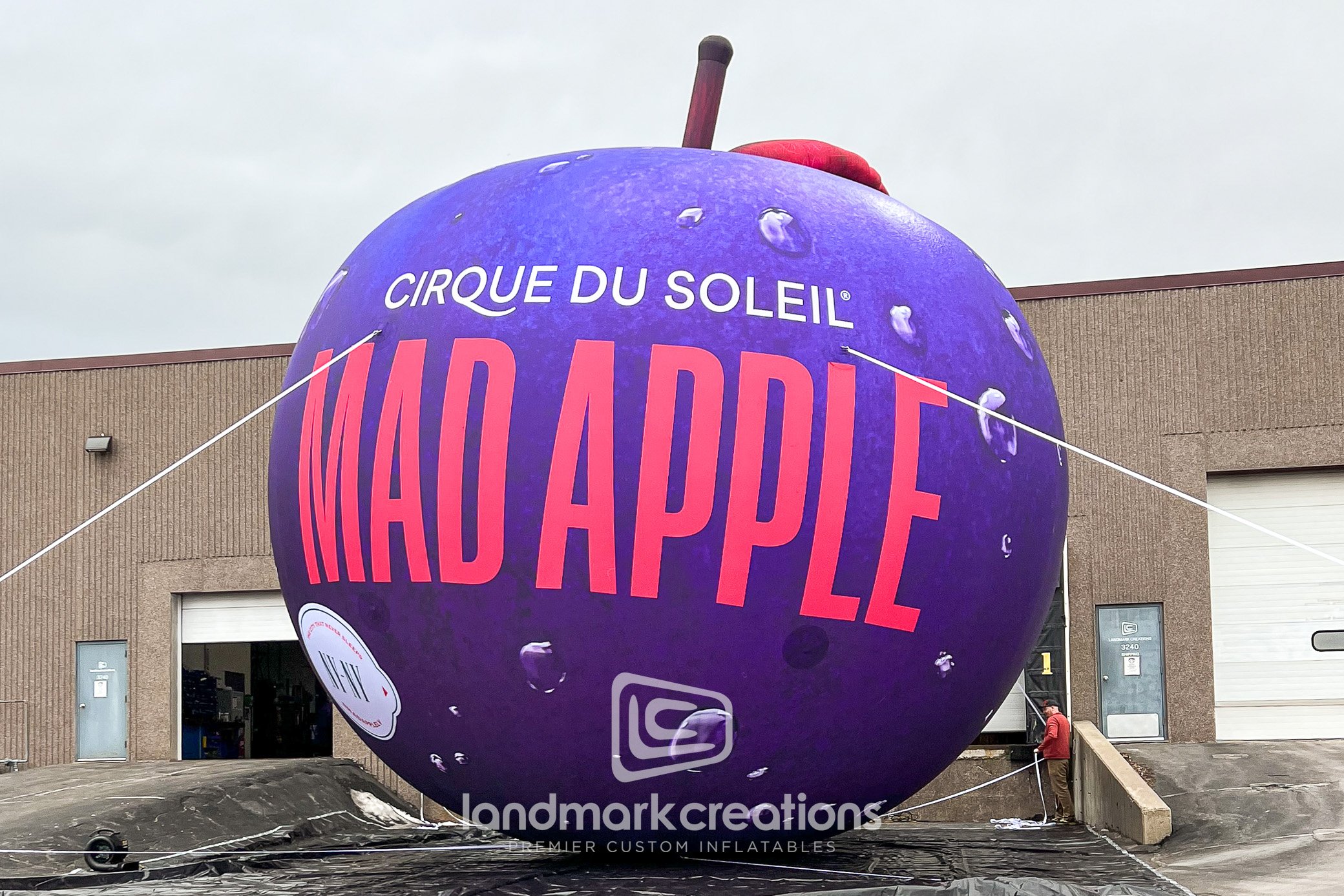 This giant inflatable apple display was placed in front of the New York, New York hotel in Las Vegas to promote Cirque du Soleil's "Mad Apple" performances. The 30-foot inflatable display withstood nine months of Nevada sunshine while creating an enormous spectacle to promote the show.