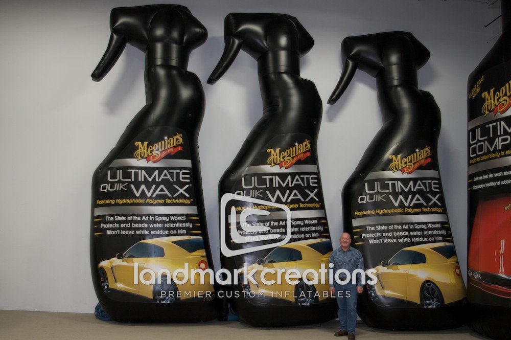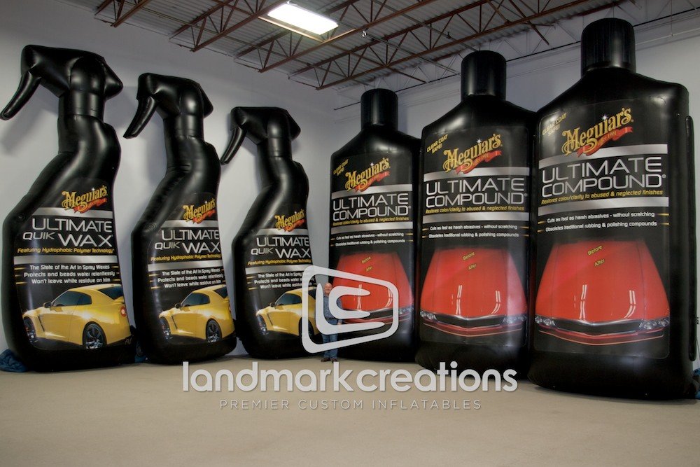 To grab the attention of car enthusiasts, Meguiar's inflates product replicas. Thanks to 3D designs and professional digital printing, inflatable product replicas like these look like their real-life counterparts, only much larger.