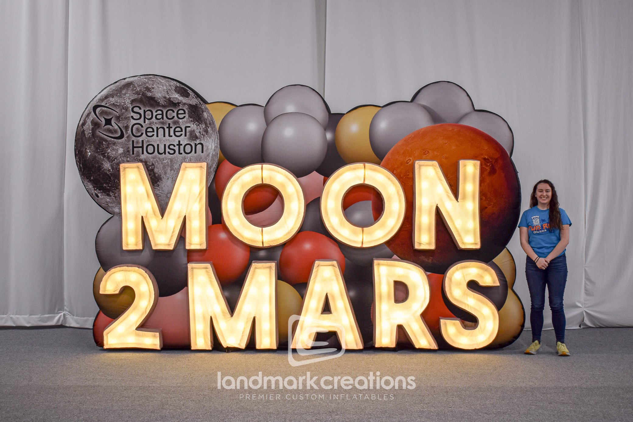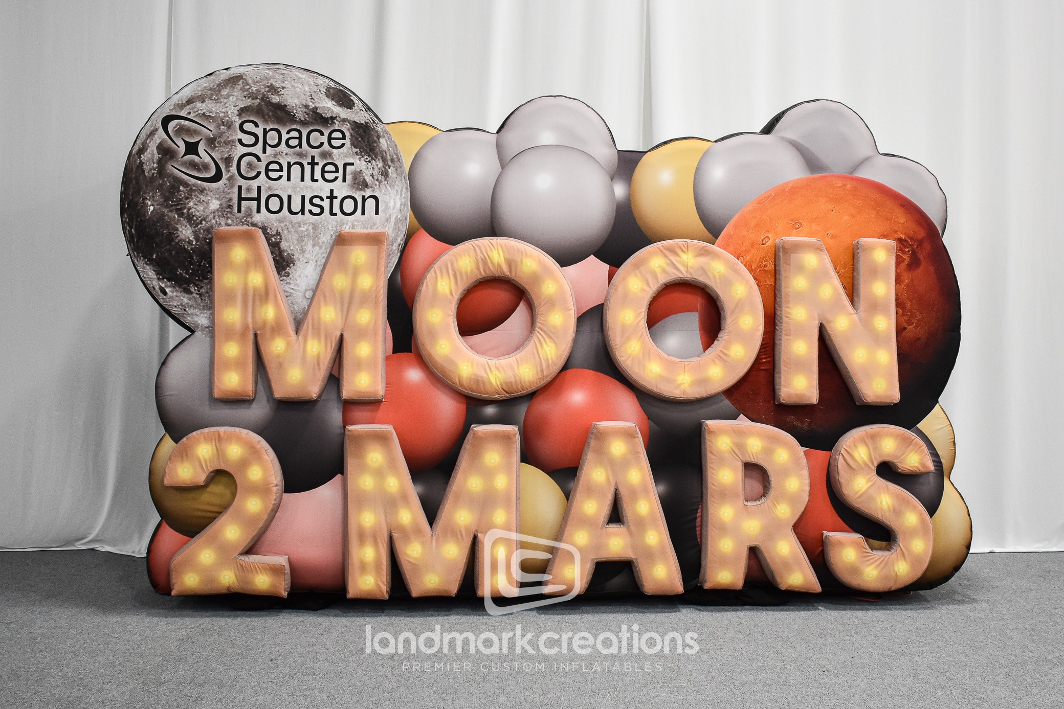 Landmark Creations designed the eye-catching "Moon 2 Mars" inflatable display for Space Center Houston's annual festival. This custom balloon display serves as both a photo backdrop and a marketing centerpiece, featuring marquee-style LED lights in bold lettering. Crafted to elevate event marketing, this reusable inflatable offers a memorable, larger-than-life experience.