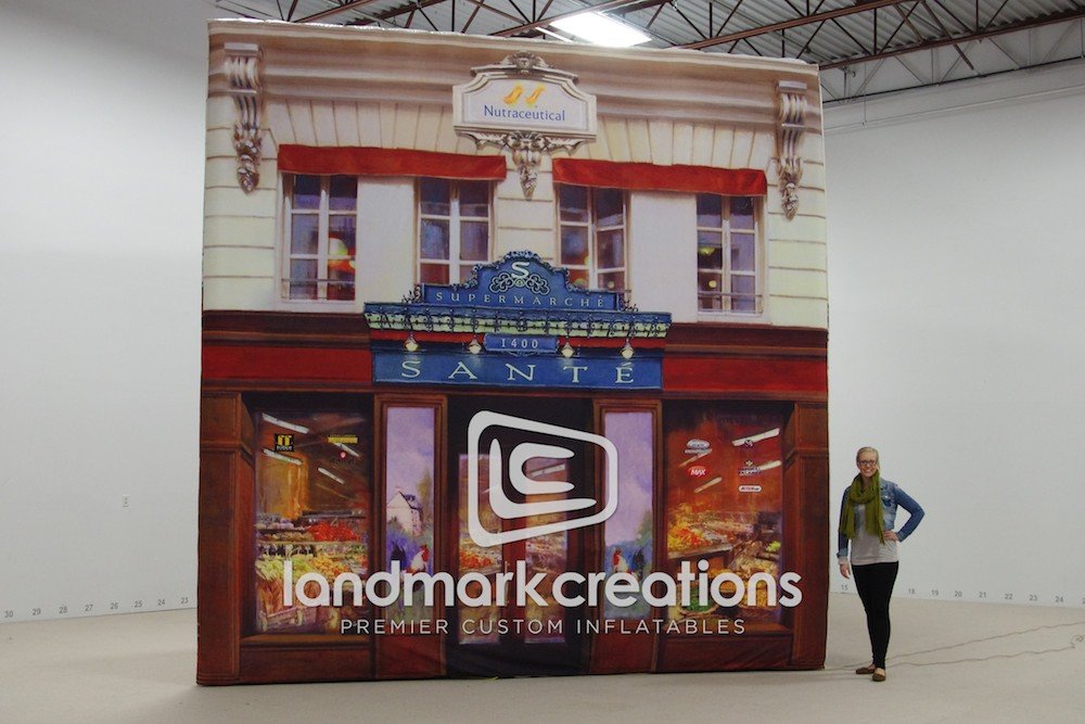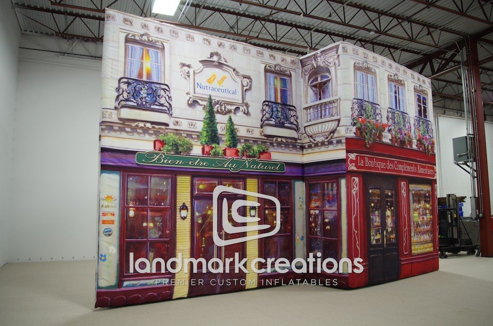 Continued advancements in technology allows artwork to be wrapped around inflatable trade show displays. Nutraceutical makes a one-of-a-kind appearance at events with this French Village display.