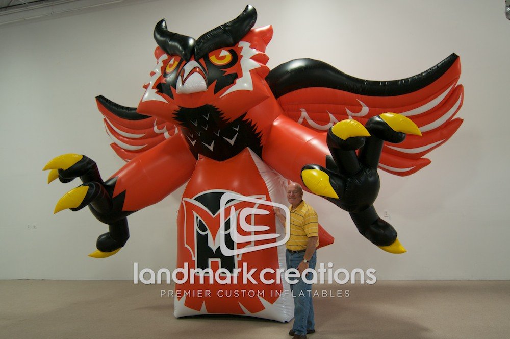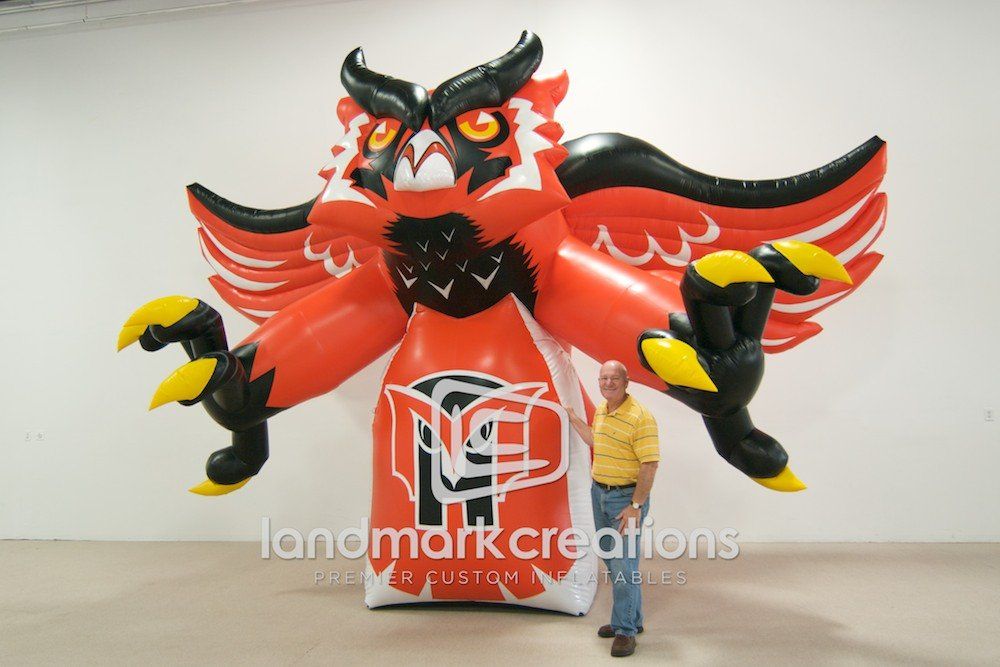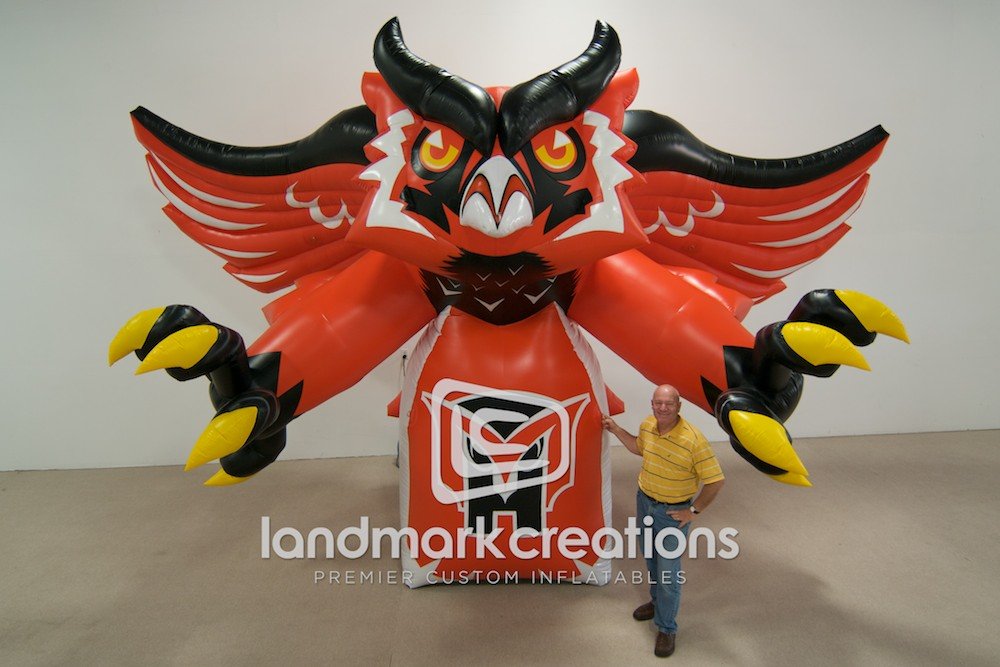 What's the key to boosting team spirit and attendance at sporting events? Inflatables, like this inflatable owl mascot for Mount Health High School, add excitement and encourage fans to cheer!