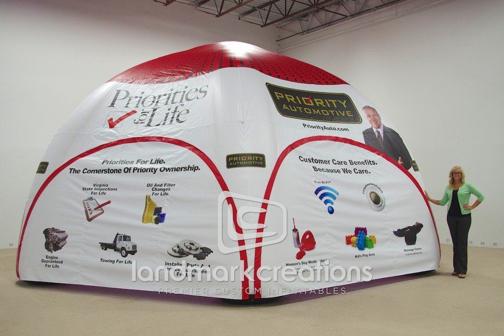 To showcase their special services Priority Automotive inflates this dome-shaped tent with removable doors. An internal lighting system completes the tent and allows promotions to go from day to night with ease.