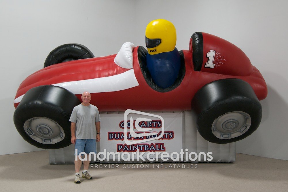 Looking for a creative way to promote your race track or family entertainment center? Custom inflatables, like this giant race car and driver are bound to get crowds revved up!