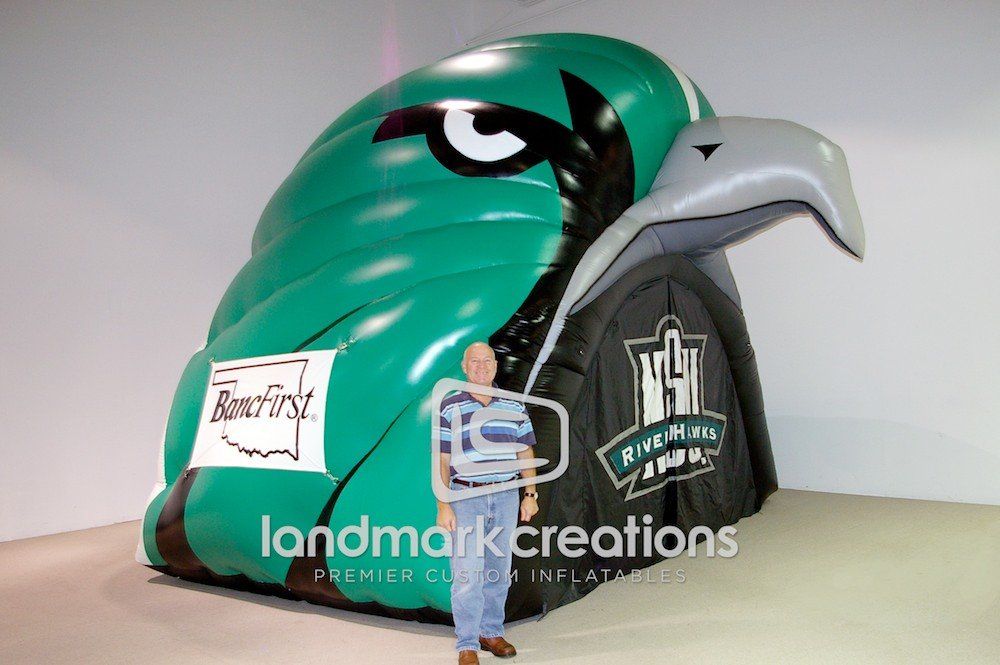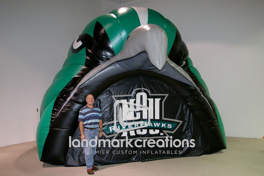 The Northern State University Riverhawks use their inflatable mascot tunnel to get fans in the stands at college football and basketball games.