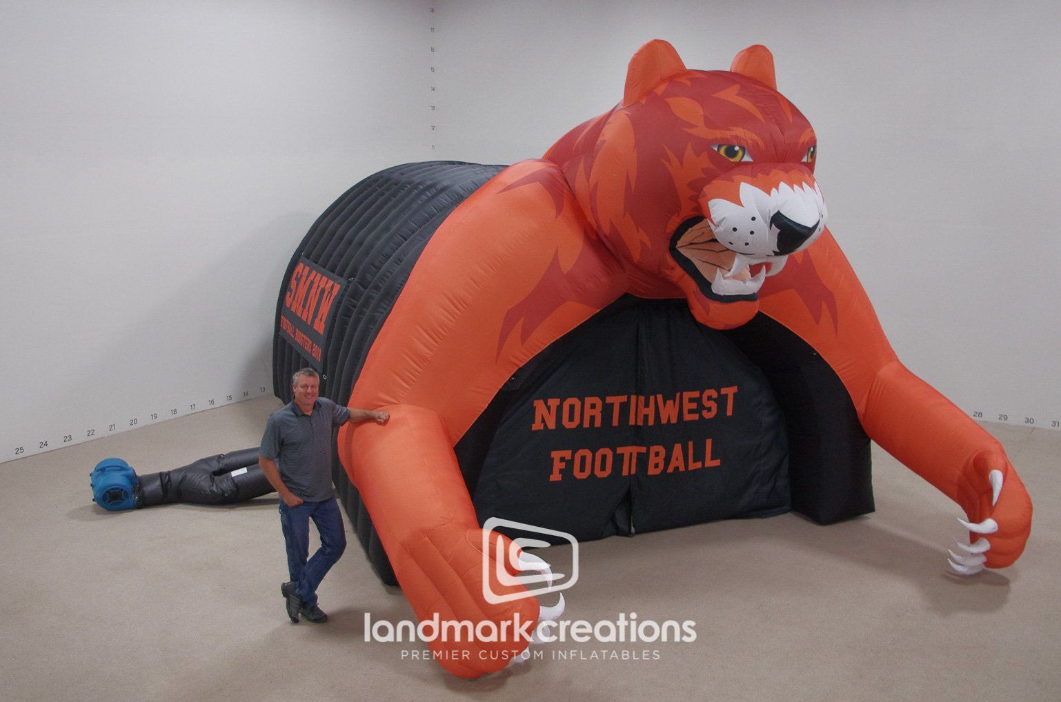 The Southwest High football team storms the field through their custom inflatable cougar football tunnel. The fierce cougar mascot replica inspires team spirit in both team players and the fans in the stadium.
