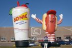 SONIC Drive-In restaurant uses this giant inflatable version of their coney dog mascot to greet visitors at grand opening events. Their inflatable coney dog mascot, with friendly smile and striped clothing, also helps promote franchise locations.