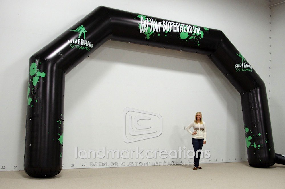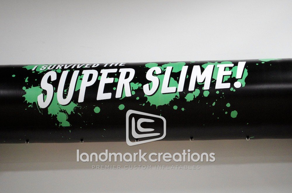 Event planners of SUPERHERO SCRAMBLE, a challenging race course, boost excitement with this custom inflatable ‘Super Slime!’ archway.