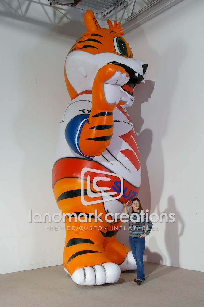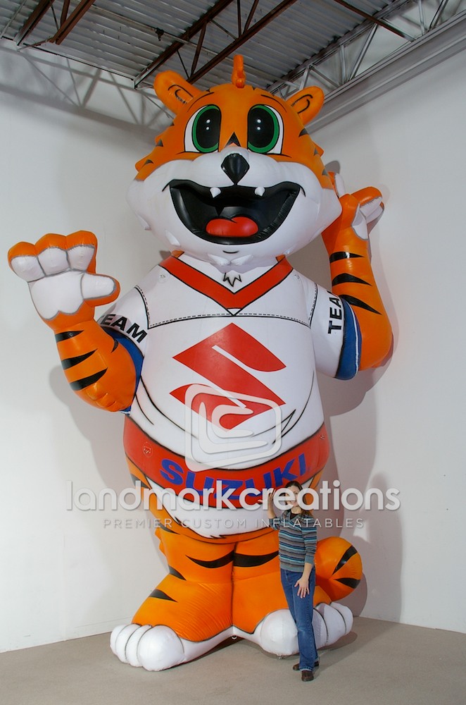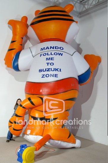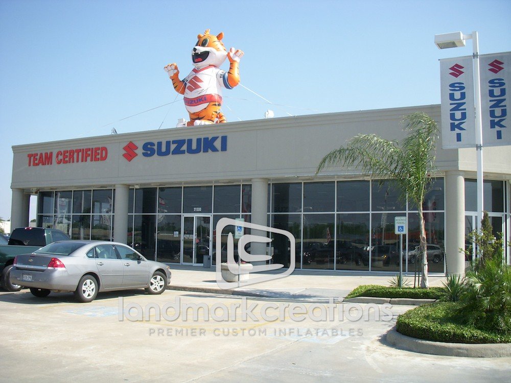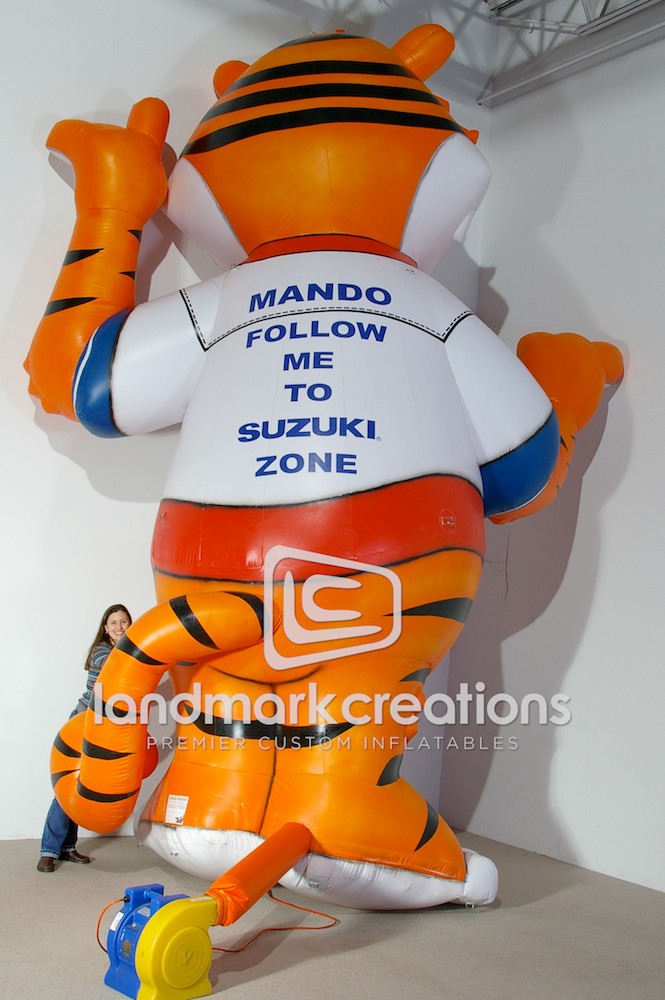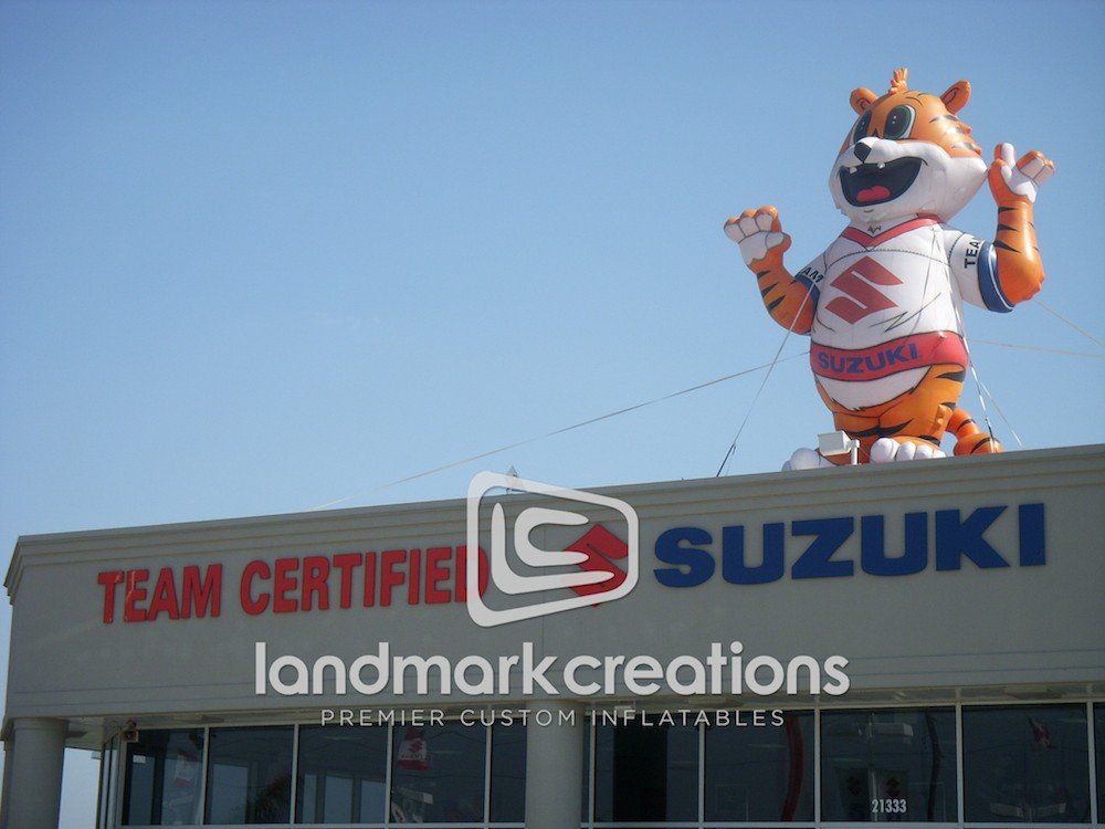 Mando the tiger, designed for a Suzuki dealership, is placed on their rooftop during promotions. Because inflatables are custom designed at Landmark Creations, the tiger mascot was produced in perfect detail to keep all of the Mando images identical.