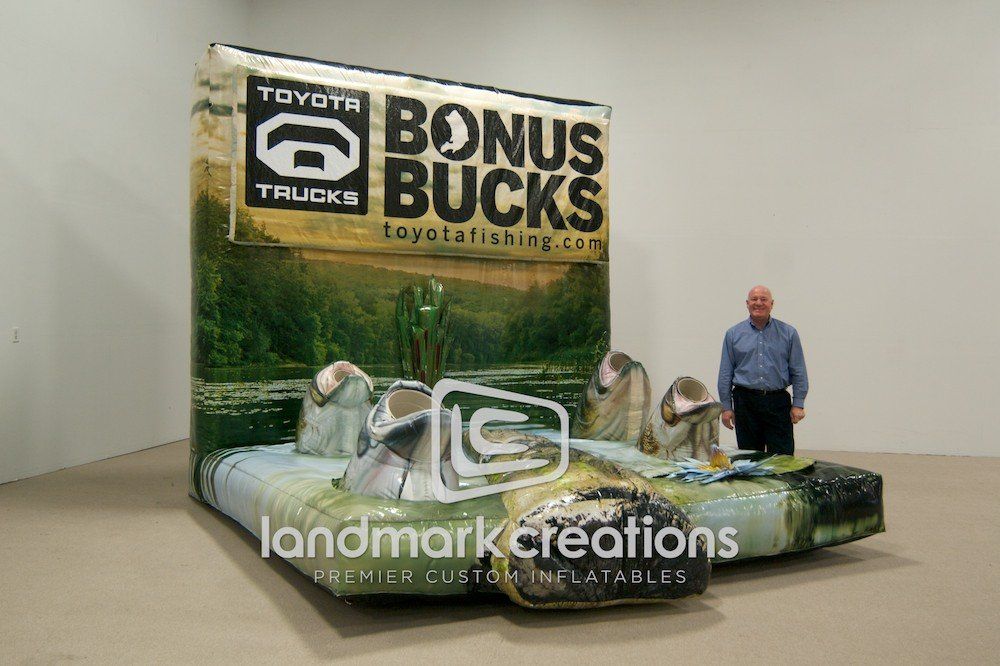 Event marketers used this inflatable interactive pond to promote Toyota's Bonus Bucks while increasing crowd participation at fishing tournaments.
