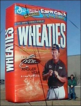 General Mills used this inflatable cereal box to celebrate the first angler to be featured on a box of Wheaties. Bass fisherman, Denny Brauer, can be seen from far and wide when the cereal box balloon is inflated!