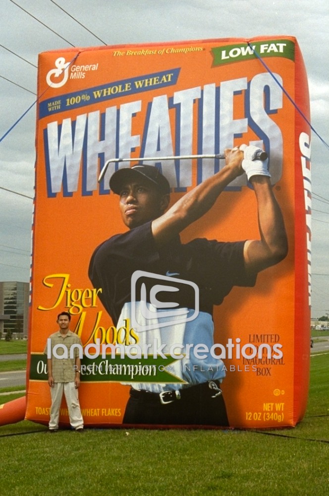 Up & Away Advertising Promotions collaborated with Landmark Creations to create a striking 20 x 14 x 5-foot Wheaties box inflatable featuring Tiger Woods. This giant product replica is designed for event marketing, drawing attention to food brands with its bold and memorable design. Perfect for outdoor or indoor events, this inflatable showcases iconic branding, making it an ideal centerpiece for food product marketers looking to create impactful, larger-than-life displays.