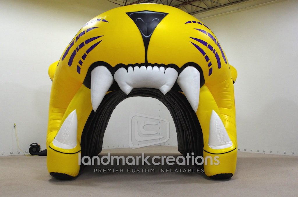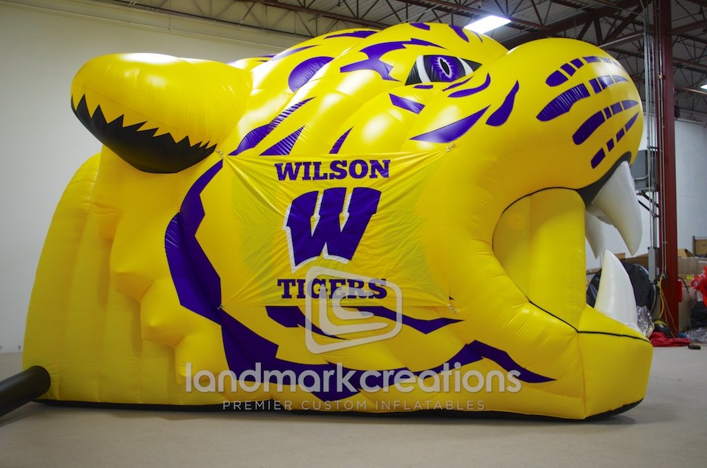 Wilson High School gets fans excited by inflating their custom tiger sports tunnel during athletic events. With bright eyes and the school emblem printed on the side banners, this inflatable tunnel is fierce!