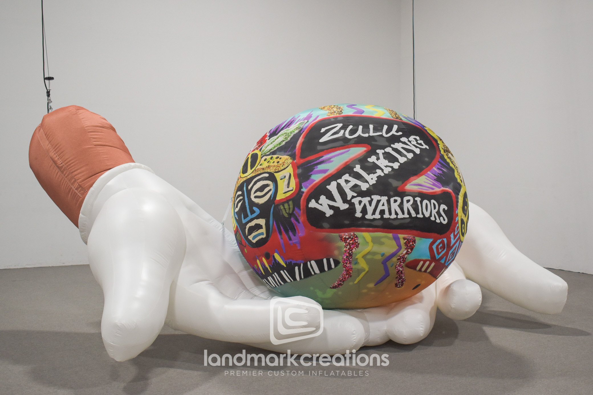 Stronghold Studios created a custom inflatable Mardi Gras display NOLA that was suspended at the Fauborg Marigny building. The inflatable display features two white gloved hands holding a zulu coconut in support of The Walking Warriors of Zulu. NOLA plans to use their custom inflatable at Mardi Gras events for many years to come.