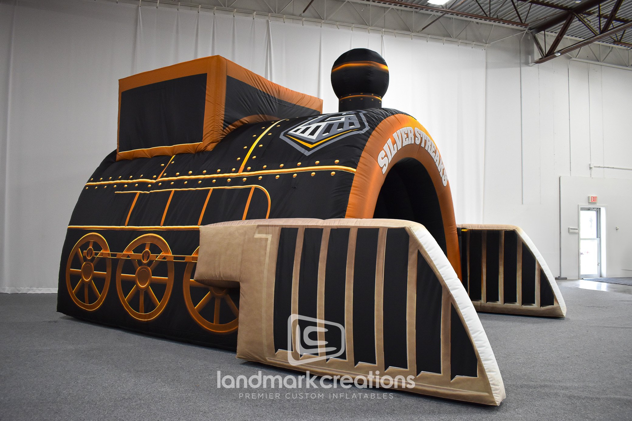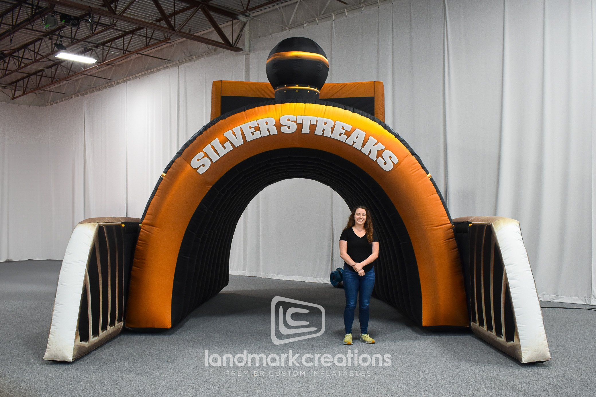 The Silver Streaks Train Tunnel, custom-made for Galesburg High School, is a striking addition to their sporting events. Crafted with durable gray paneling, gold gears, and the school's "G" logo, this inflatable sports tunnel creates a grand entrance for players, boosting excitement and school spirit. Designed for both indoor and outdoor use, it's a perfect fit for high-energy events like football games and rallies, enhancing fan engagement and team pride.