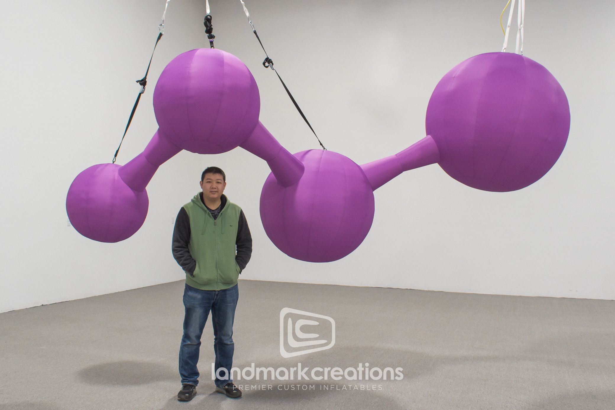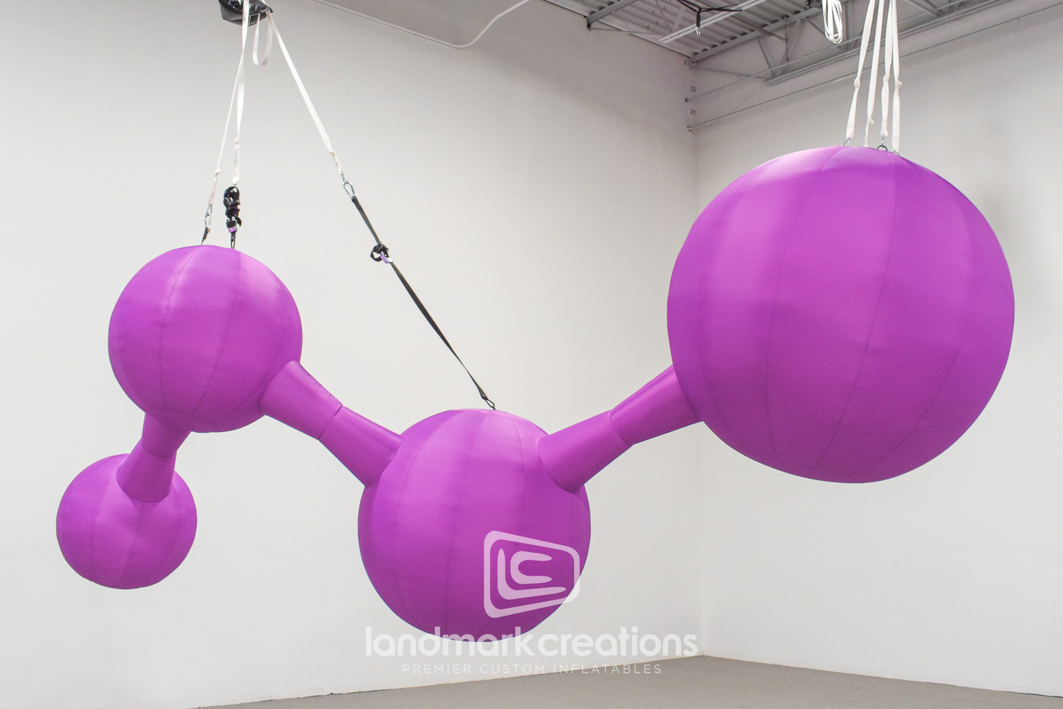 Our custom Curia Molecule Display was crafted as a striking visual centerpiece for trade shows and museum exhibits. Designed for indoor hanging, this inflatable replica features bold, purple molecular structures, offering a unique and engaging display for science, pharmaceutical, or biopharma events. Elevate your event with a custom inflatable that blends scientific accuracy with artistic presentation.
