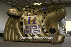 This is what most people think of when inflatables come to mind. Available in custom sizes and designs, cold-air inflatables can be mounted on the ground, on rooftops, indoors or at any fixed location. They inflate with the aid of a blower system in just minutes bringing your product replica, mascot, logo or sports tunnel to life.