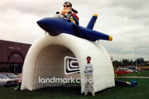 This is what most people think of when inflatables come to mind. Available in custom sizes and designs, cold-air inflatables can be mounted on the ground, on rooftops, indoors or at any fixed location. They inflate with the aid of a blower system in just minutes bringing your product replica, mascot, logo or sports tunnel to life.
