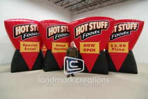 This is what most people think of when inflatables come to mind. Available in custom sizes and designs, cold-air inflatables can be mounted on the ground, on rooftops, indoors or at any fixed location. They inflate with the aid of a blower system in just minutes bringing your product replica, mascot, logo or sports tunnel to life.