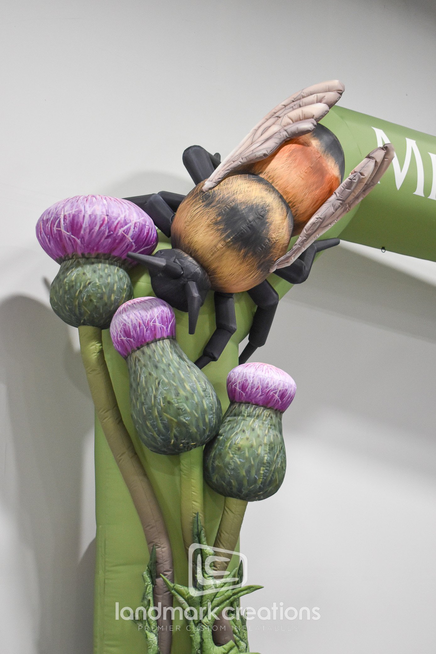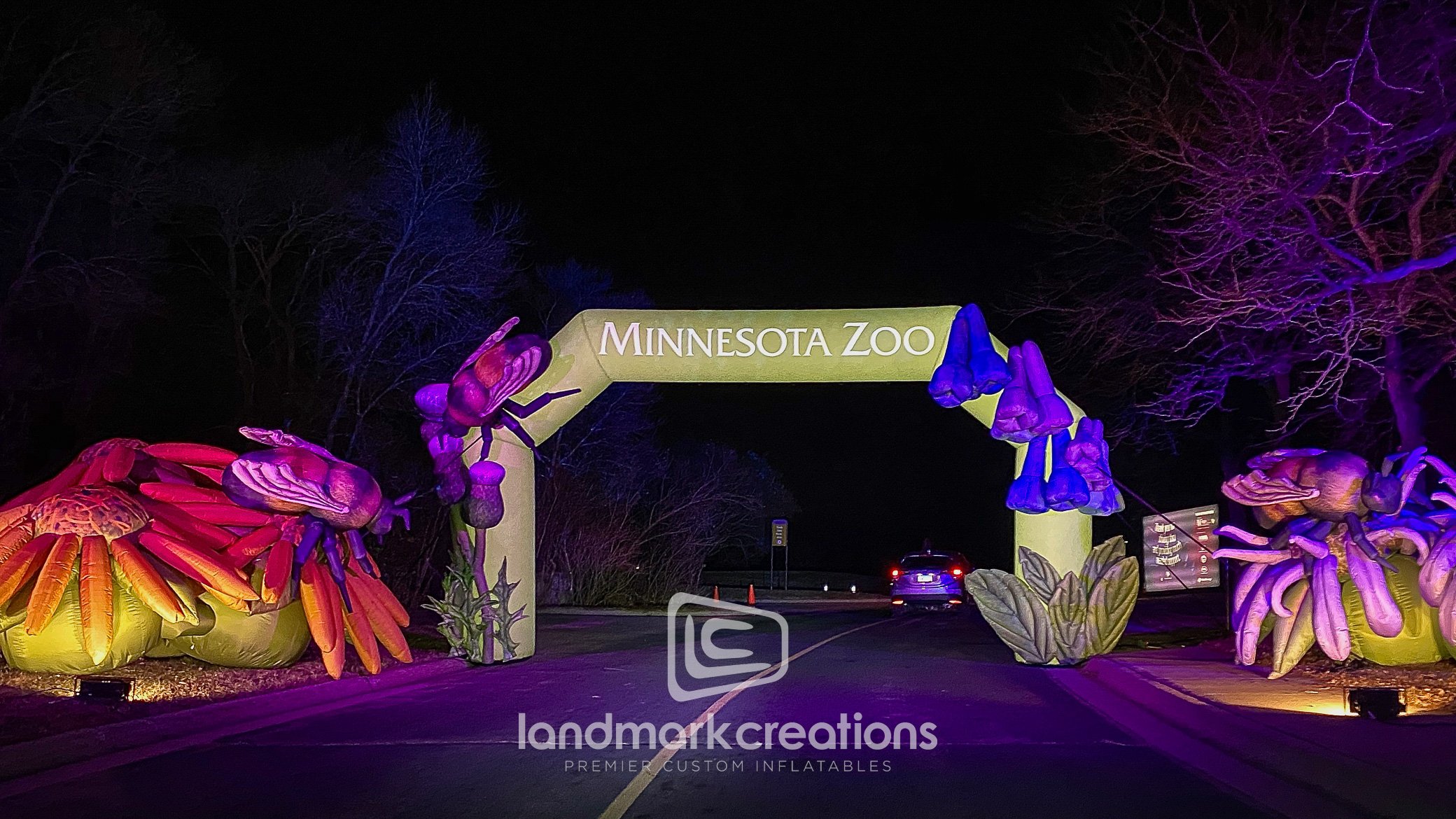 The inflatable exit arch display featuring bees and native flowers creates a gorgeous photo opp and parting visual for attendees of the Minnesota Zoo's "Nature Illuminated" drive-through event.