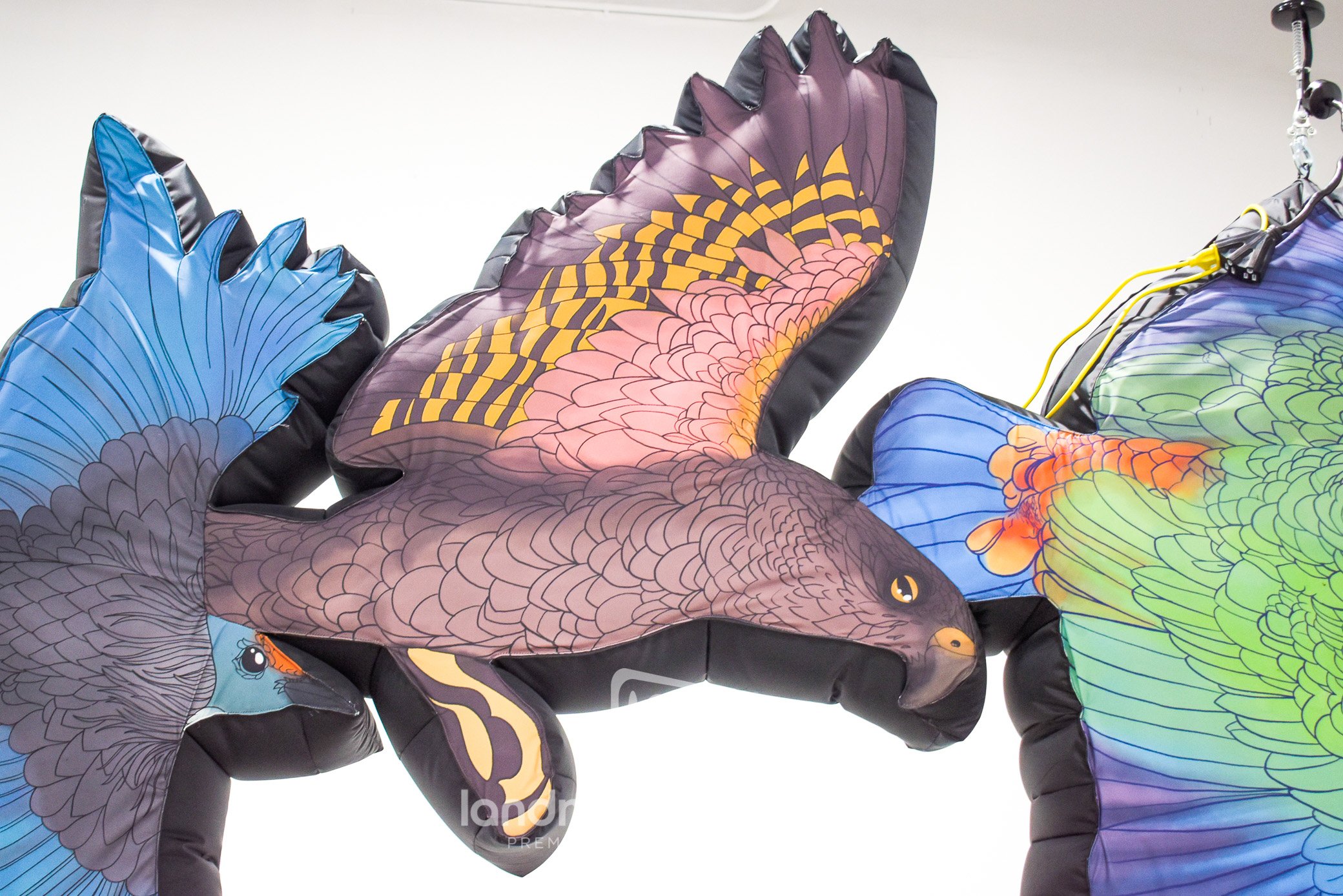 Indie Pop Group, The Beths, set the stage for bird watching with this vibrant set display featuring stylized parrots. Weighing less than 30 pounds, this inflatable set piece can be easily packed and stored between shows.
