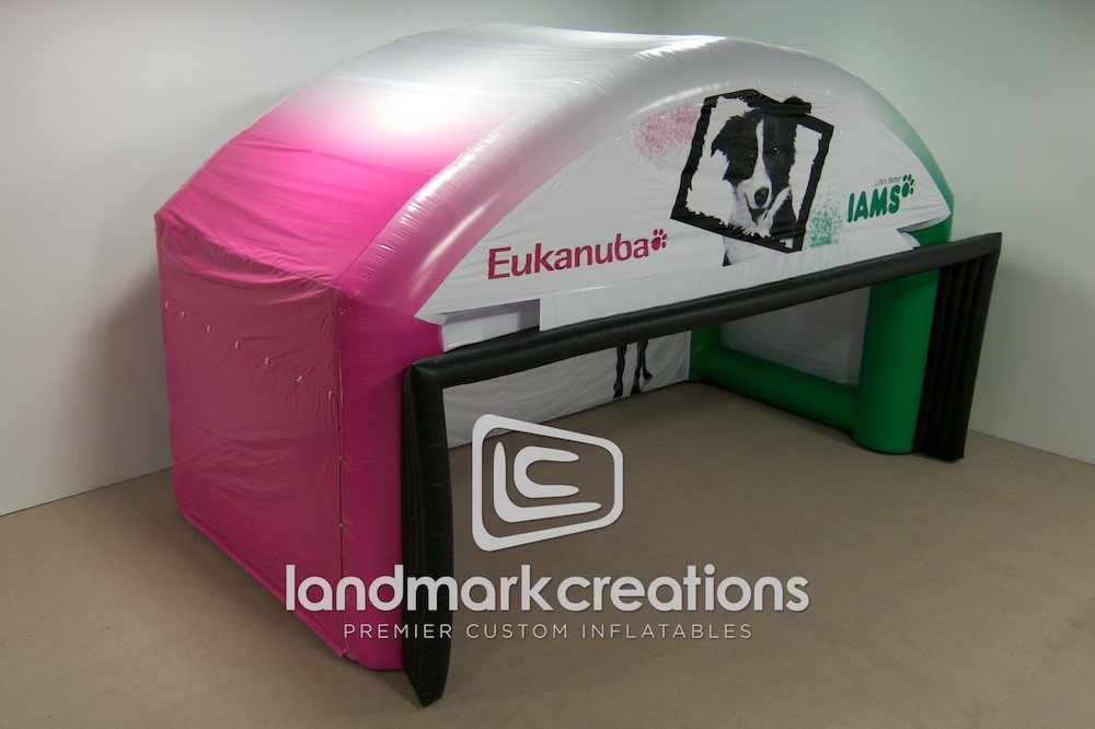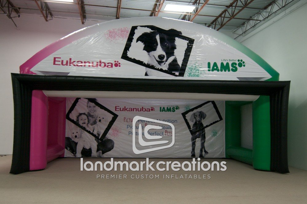 Increase visibility with an inflatable booth like the one made for Eukanuba and Iams. pet food brands. With a generous area for giving away product samples, this booth was a big hit by owners and their pets.