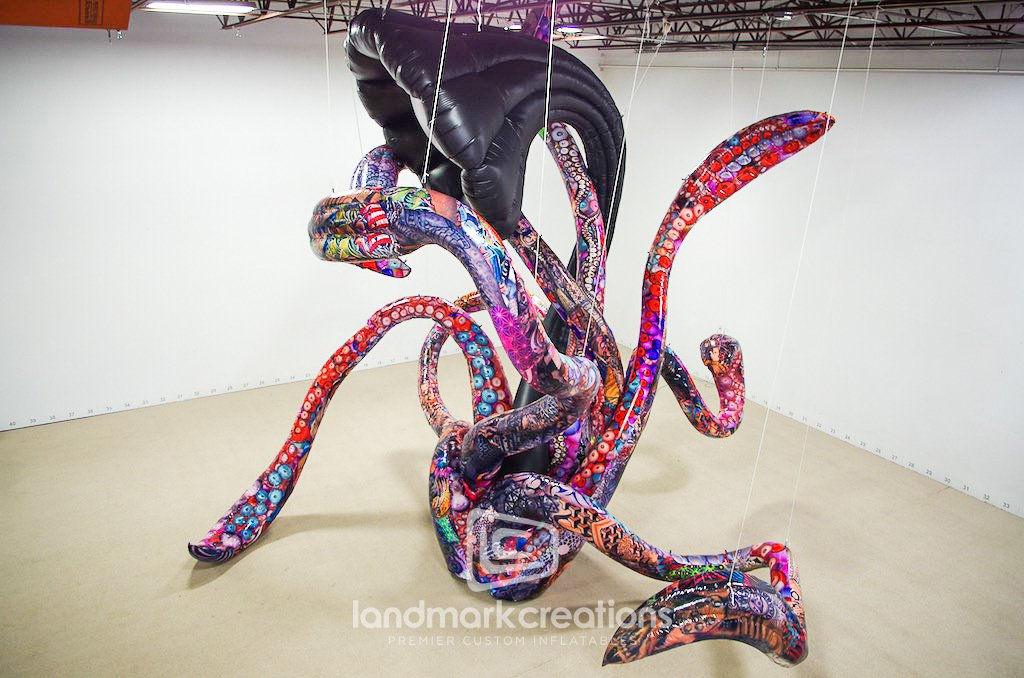 Art Installation "Whatisit" by artists Brian Kane intrigues viewers. In addition to "Whatisit", Brain Kane has realized several of his artistic visions in giant form using the inflatable medium. Some of his other installations include shapes like location devices, speech bubbles, and a chrome anvil. The level of detail the Landmark team can achieve using custom inflatables alone or by integrating fabricated components allows us to help any artist create, or recreate, their vision on a giant scale.
