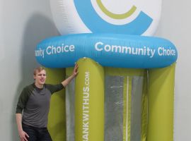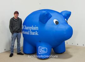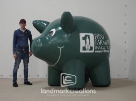 The friendly inflatable piggy bank mascot connects with crowds at community events in Oelwein, Iowa. The bank's logo is prominently displayed on either side of the adorable inflatable piggy, and thanks to the inflatable's internal light system, it can be seen at live events both day and night. Inflatable mascots in this size range pack very small and can be easily managed, stored, and transported by a single individual using a standard sized vehicle.