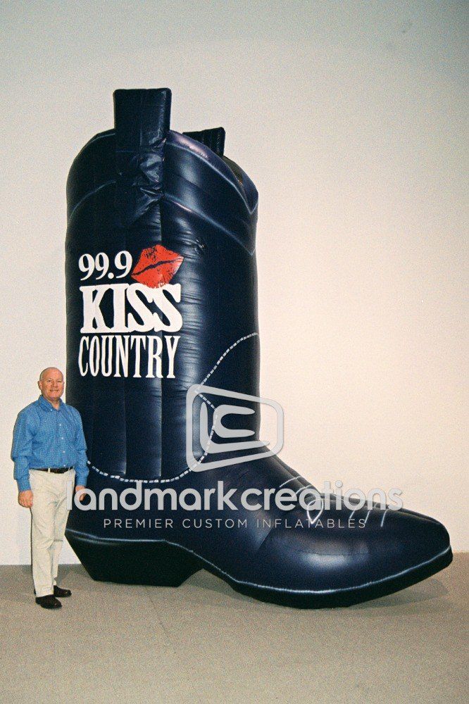 Radio stations, like KISS Country, use advertising inflatables at community events and radio remotes. The inflatable cowboy boot attracts major attention whenever inflated!