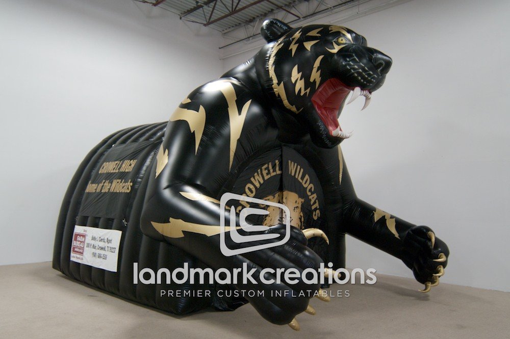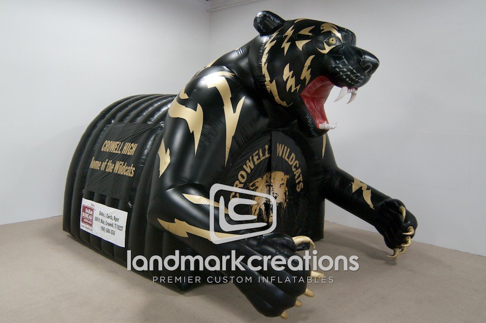 Players of the Crowell Wildcats football team in Texas make a wild entrance through this 14-foot mascot-topped inflatable sports tunnel during home games.