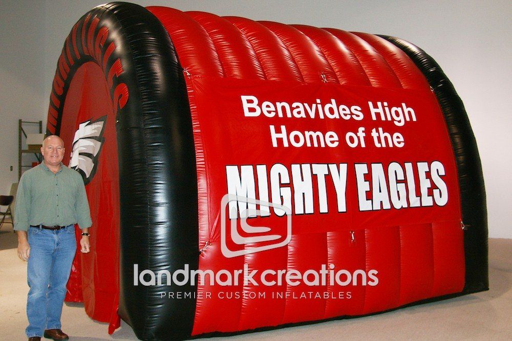 Benavides High School inflates their traditional sports tunnel at athletic events. The team tunnel is completed with interchangeable side banners and emblem printed on the break away doors!