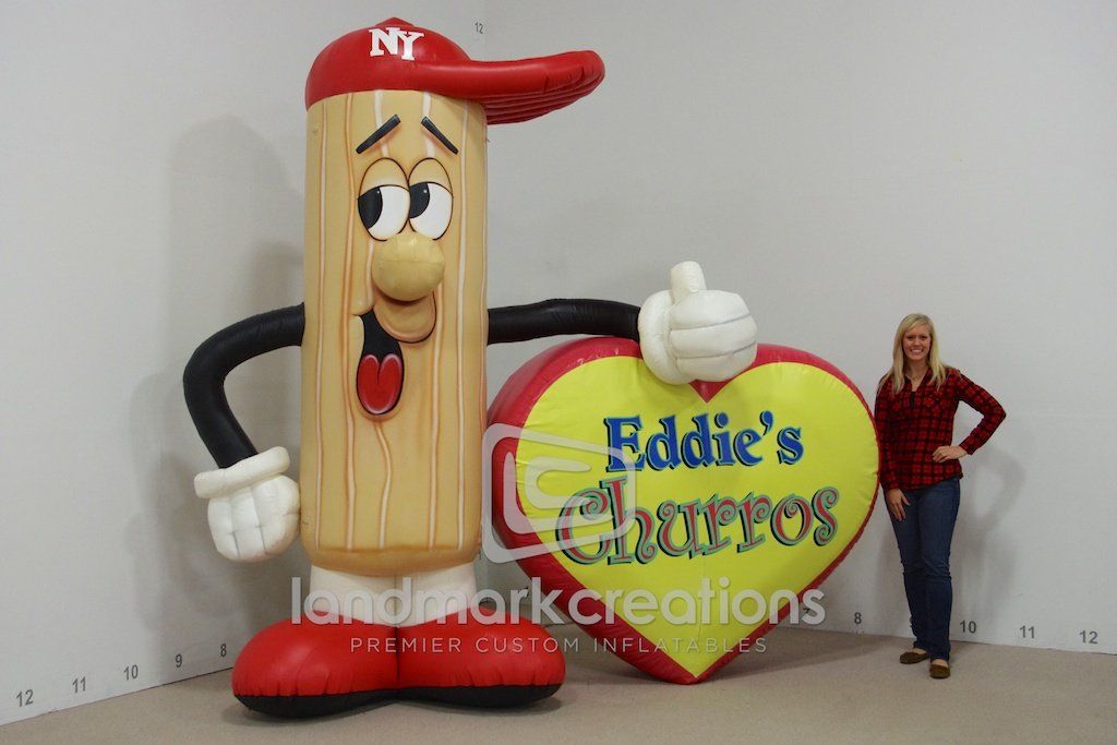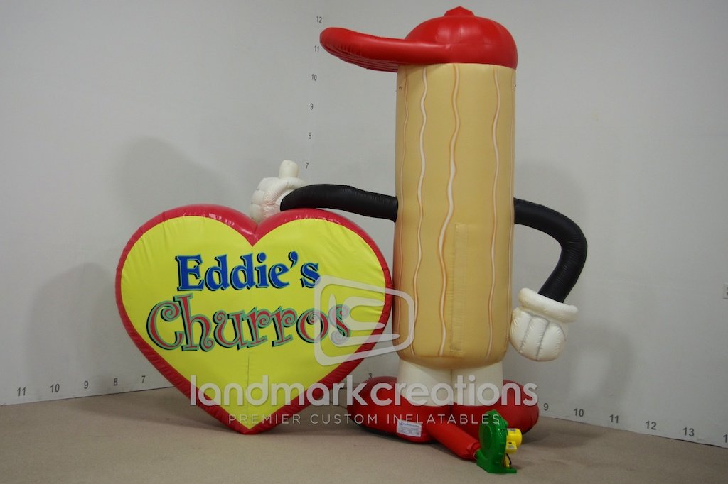 This inflatable churro mascot was placed on top of Eddie's Churro Wagon to attract traffic and increase food truck sales. Custom-designed inflatable characters add a major "wow factor" to food trucks!
