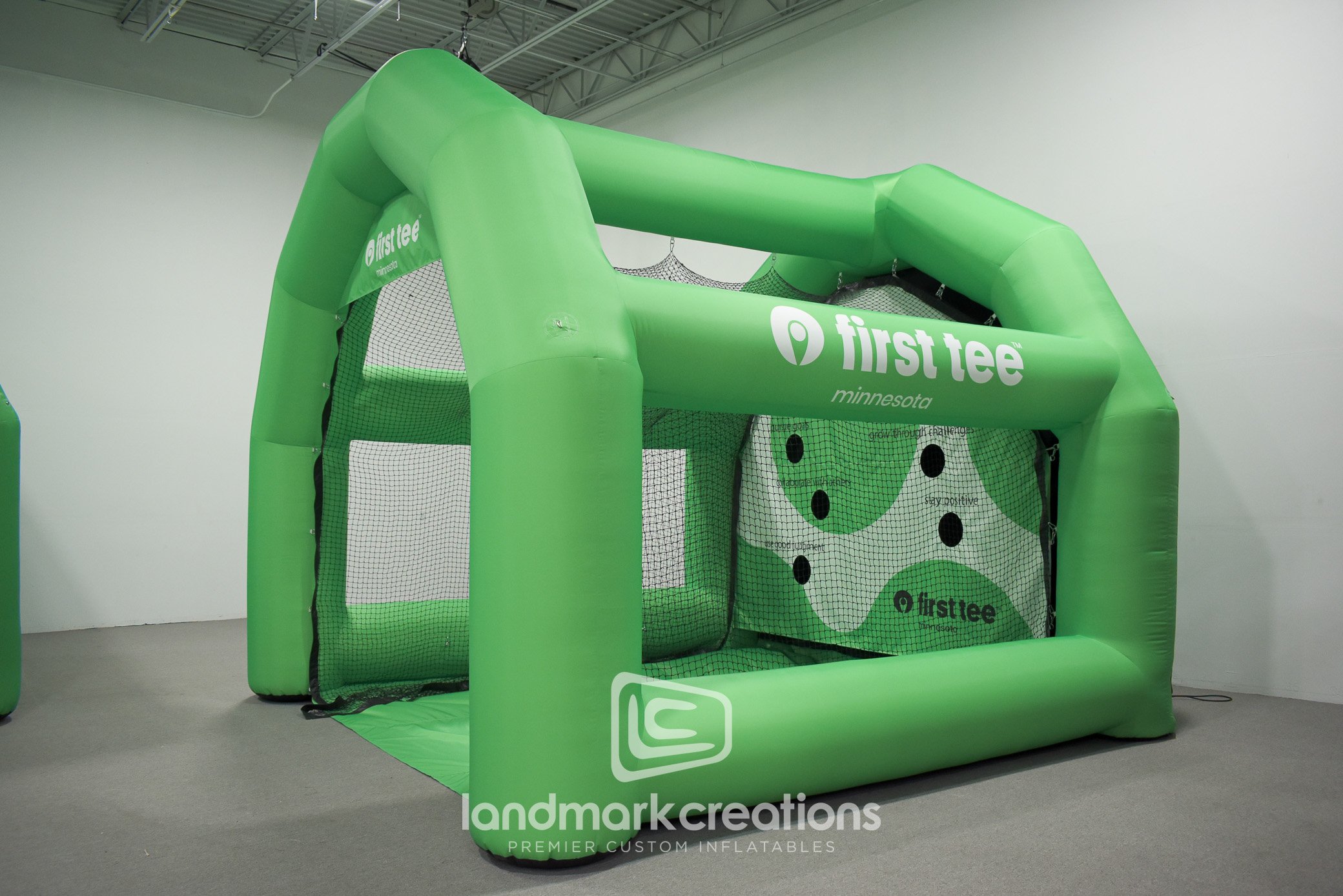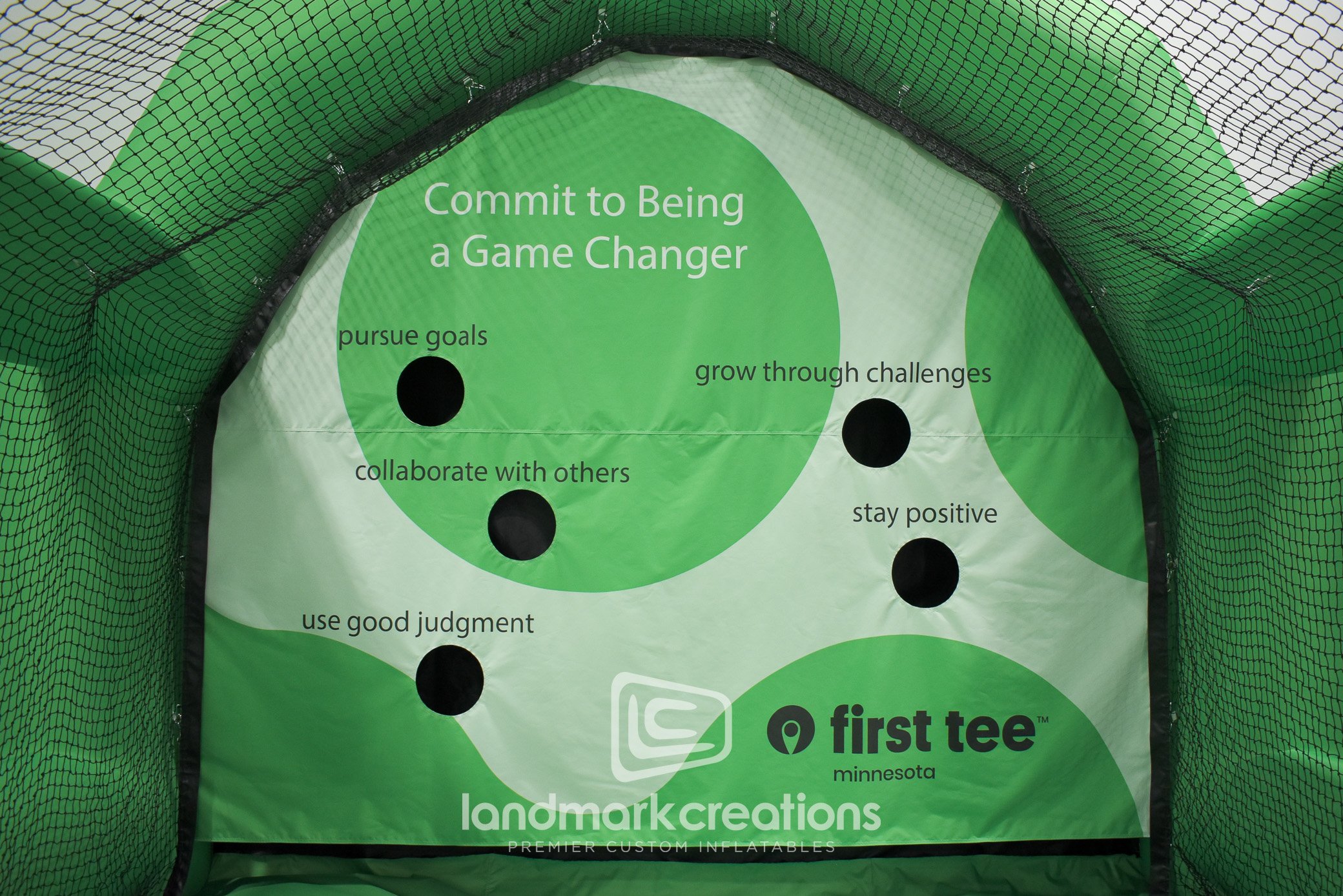 First Tee created a custom inflatable golf cage to promote their golf lessons and clinics at various community events like National Night Out. Their custom inflatable included a backdrop with positive messaging supporting their organization's brand and values. Because they're easy to pack and transport, inflatable golf cages can be easily stored and taken between events.