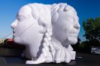 Chicago-based arts collective Floating Museum displayed this spectacular four-faced bust of the city’s oft-overlooked founders, its indigenous peoples and people of color, along the CTA Green Line in the summer and fall of 2019. The faces portray the first non-native man to settle in what would become Chicago, the French Hatian Jean Baptiste Pointe Du Sable; his wife, Potawatomi tribe member Kitihawa; former Chicago mayor Harold Washington; and the face of a child.