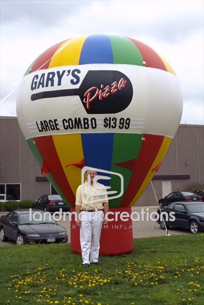 This giant hot air balloon-shaped inflatable, made for Gary's Pizza, attracts attention from far and wide. This inflatable also has a banner that can be changed to advertise special menu items and promotions.