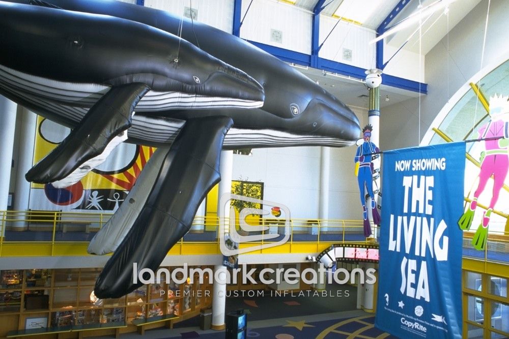 These mother and daughter humpback whale replicas were inflated and displayed in the main entrance of the Children's Museum of Indianapolis. The inflatable whales give museum visitors a highly detailed, realistic feel for the true size of these impressive mammals.