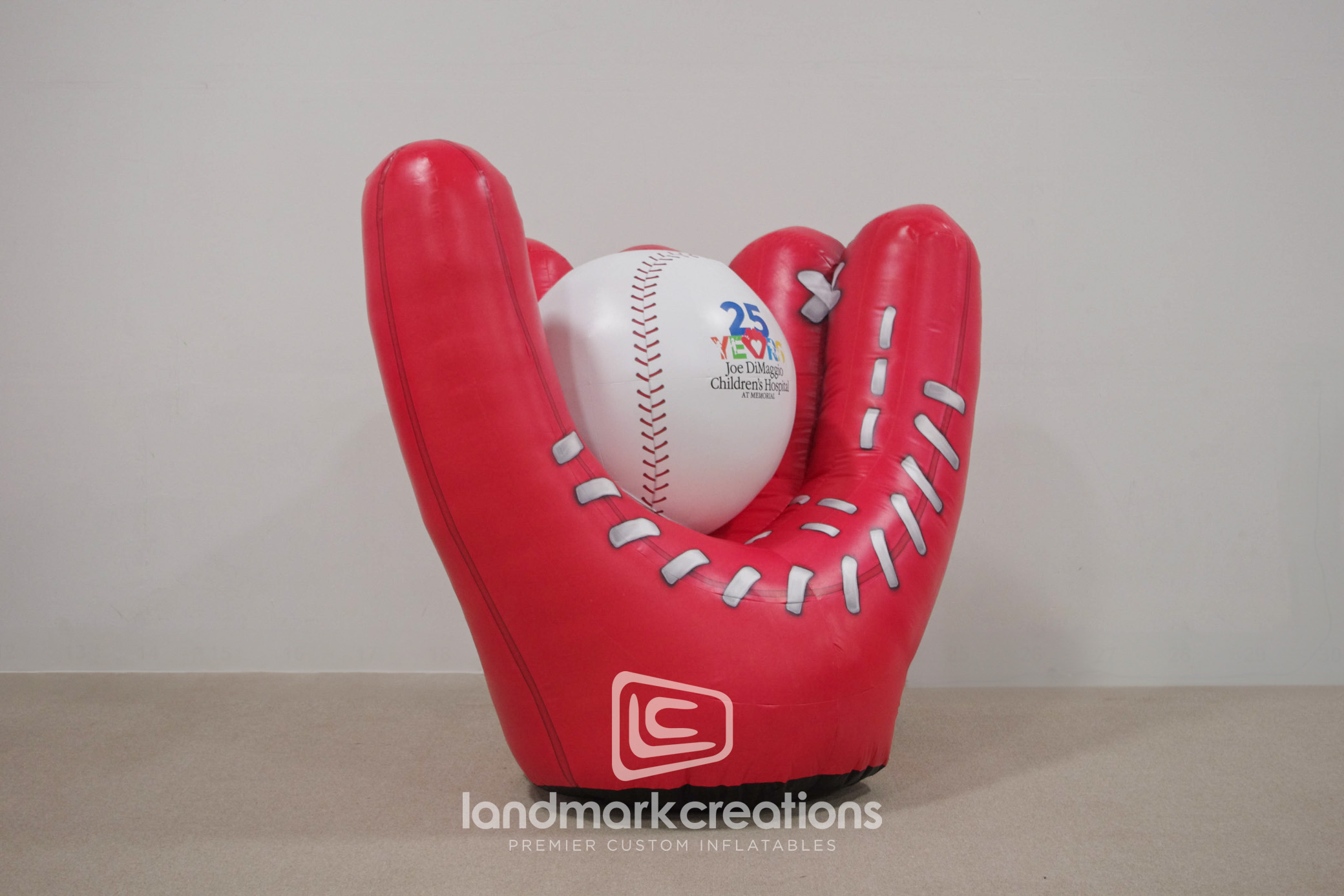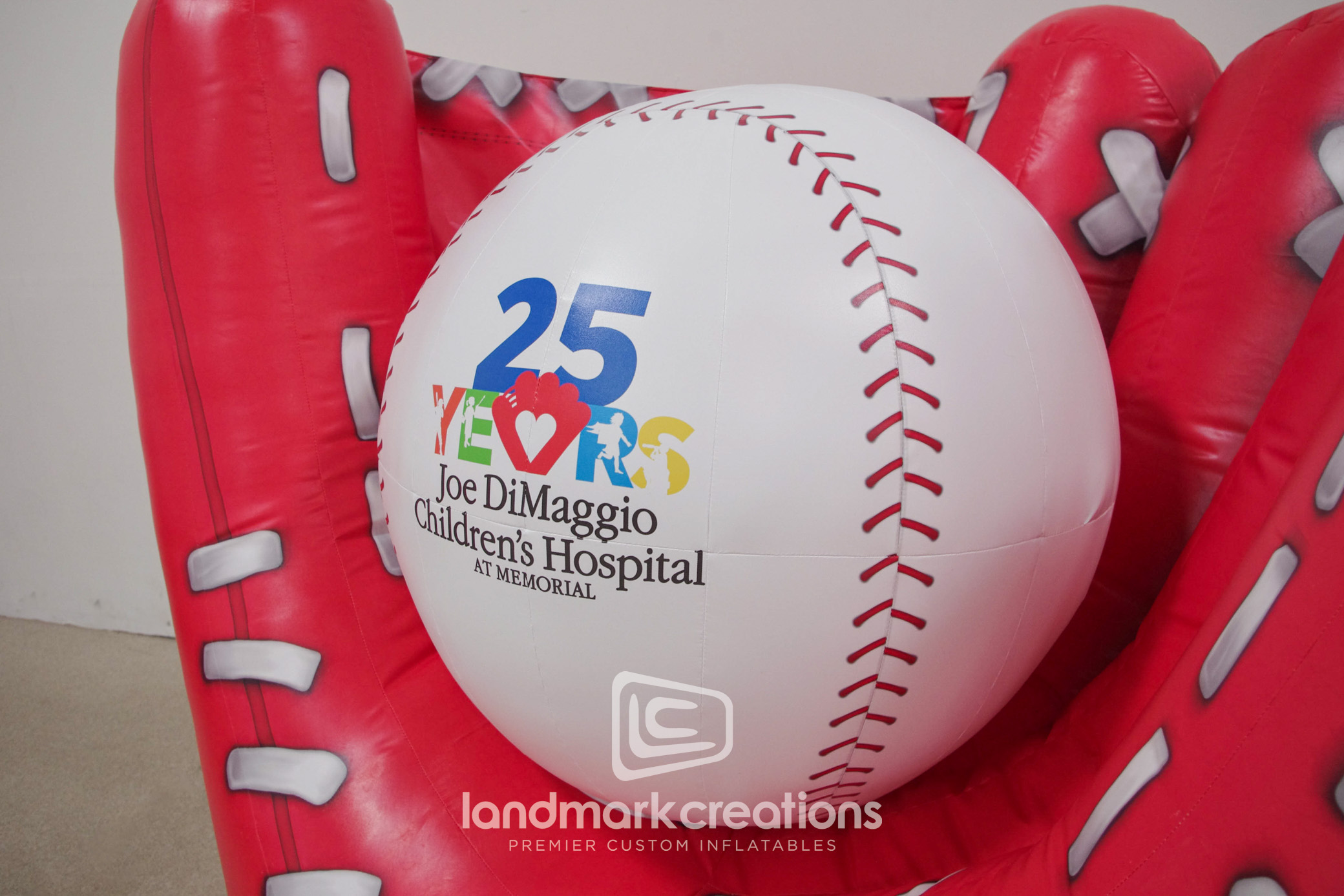 Crafted for Starmark's event benefiting Joe DiMaggio Children's Hospital, this custom inflatable red baseball glove replica featured a zippered palm for interchangeable baseballs, enhancing engagement at the Hollywood, FL fundraiser.