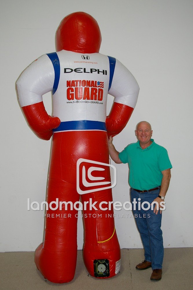 The National Guard uses their inflatable race car driver mascot complete with sponsorship on his driving jacket at racing events! Race car fans love taking pictures with the inflatable driver.