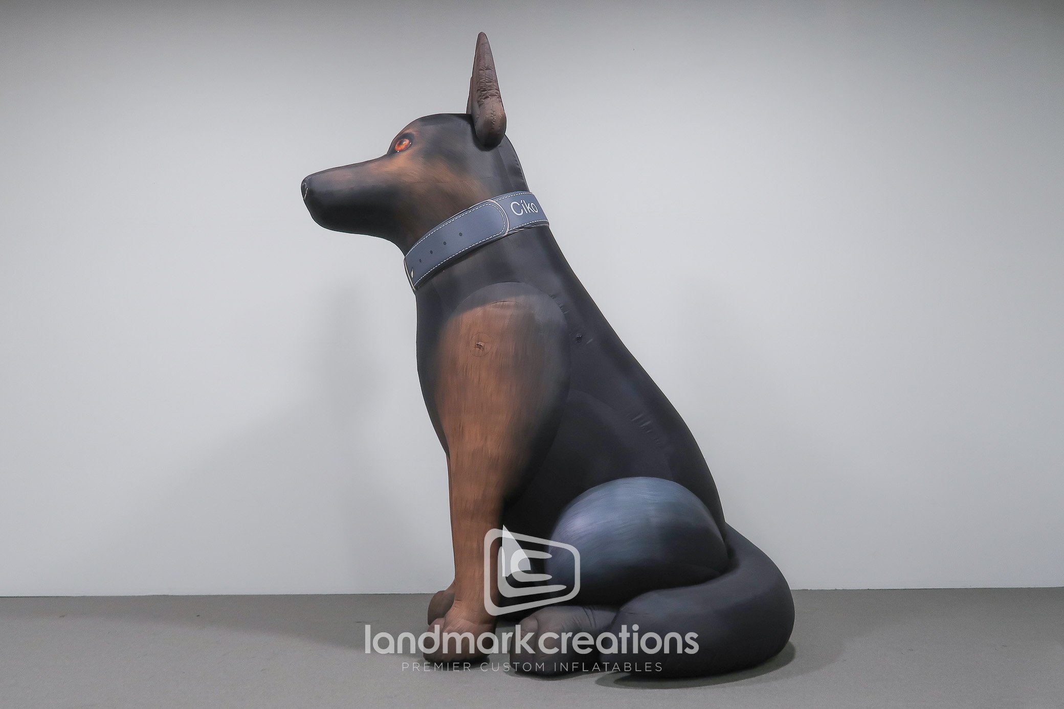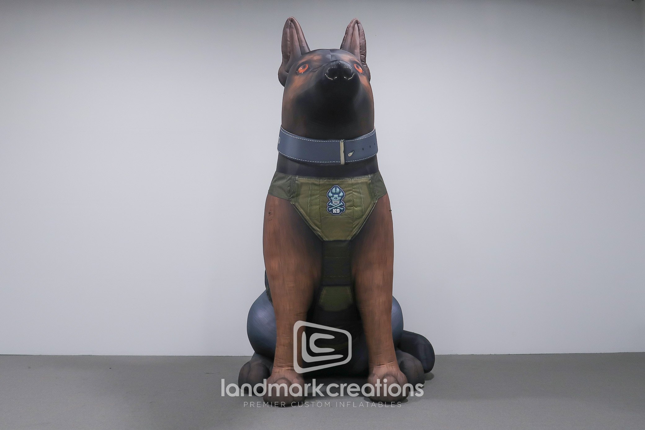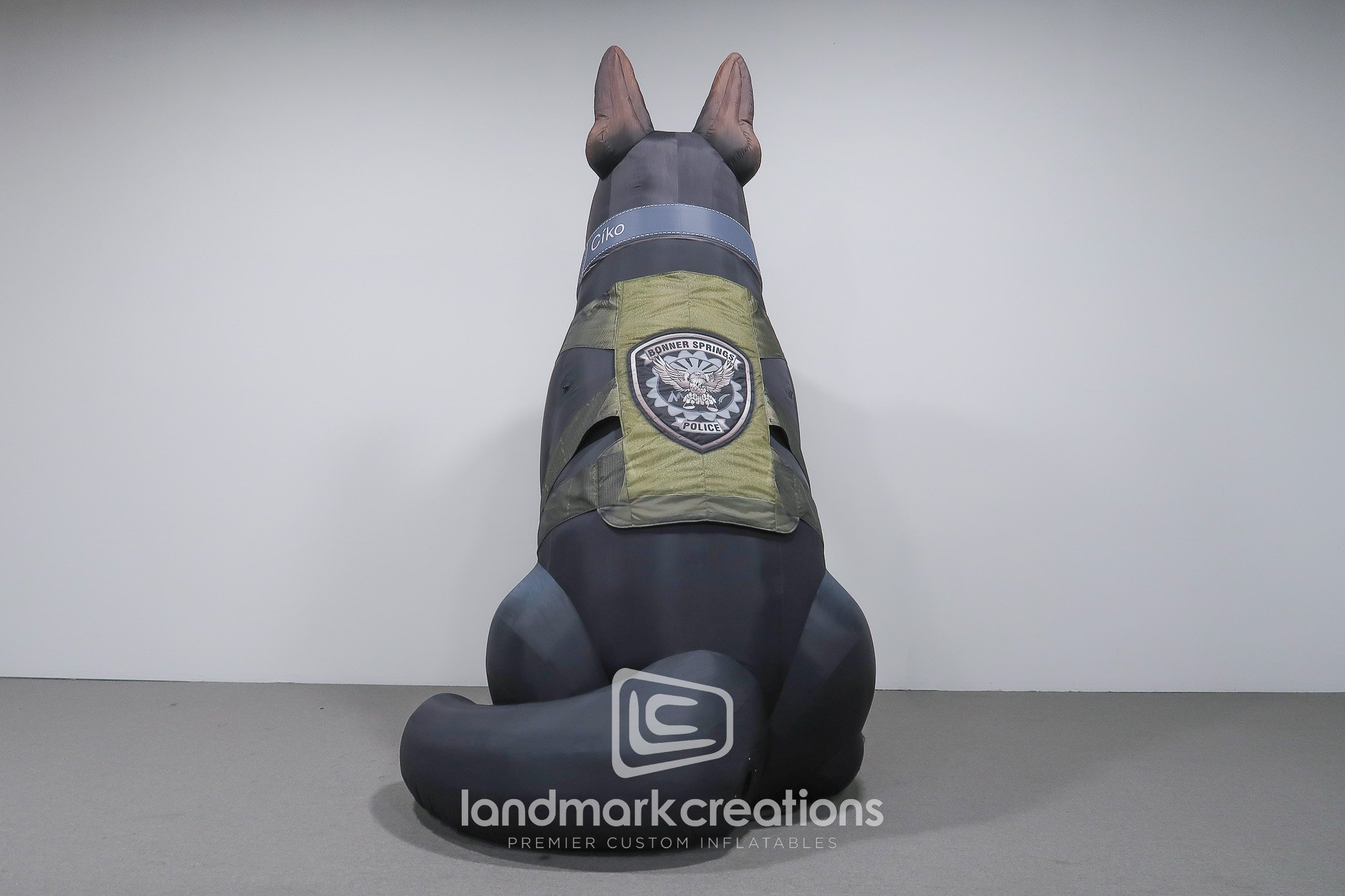 This custom inflatable police dog was modeled after "Ciko", a member of the Bonner Springs Police Department’s canine team. Giant inflatables can be customized with fur markings and uniform badges to commemorate or memorialize your specific working dogs. Because they're easy to set-up and transport, inflatable mascot replicas are a perfect way to engage with the community at special events.