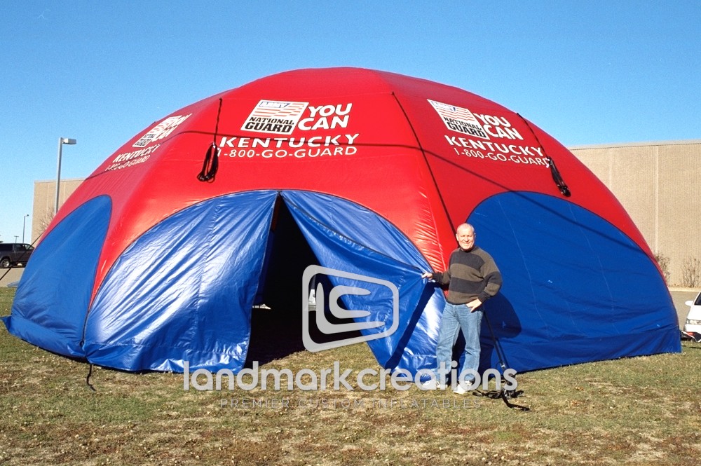 Dome-shaped inflatable AirTents give your business 360-degrees of promotional space, inside and out. KANG gets attention at military recruitment events and outdoor festivals with this red, white and blue military tent.